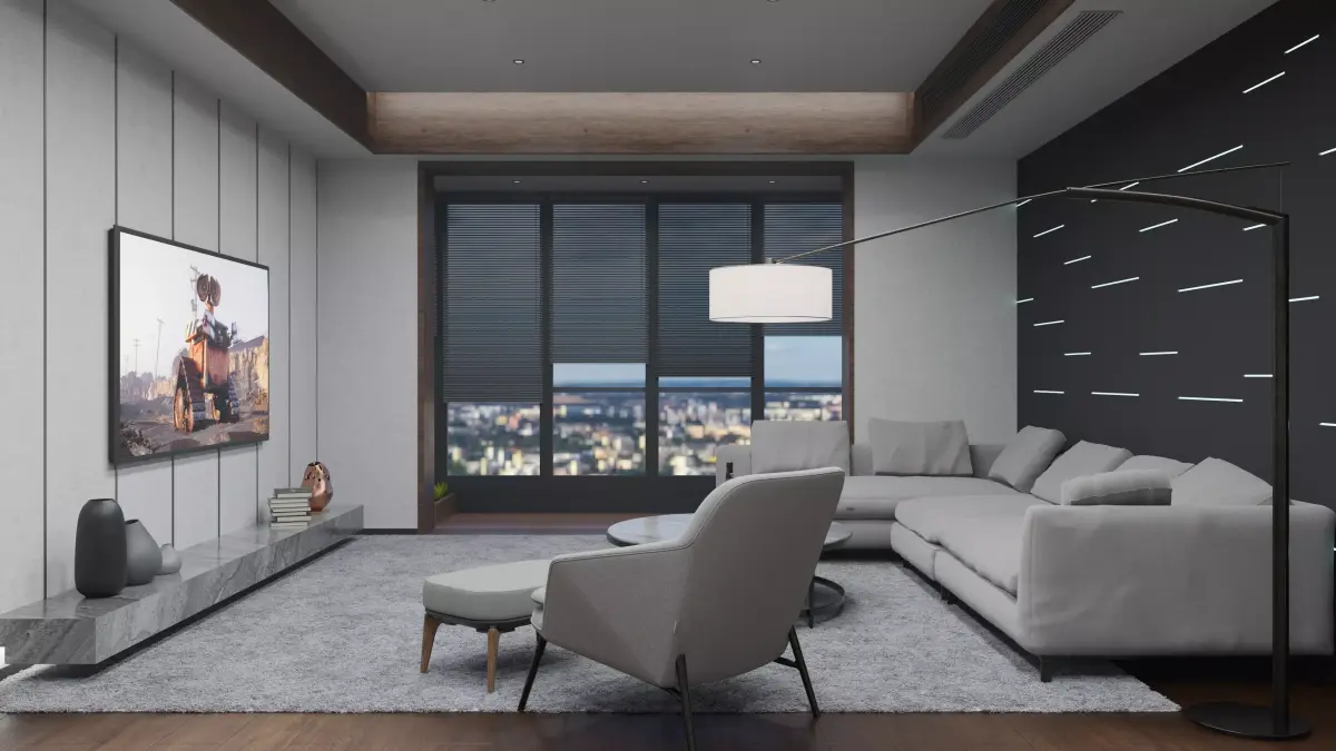 Furniture and LayoutThe furniture selection prioritizes a low-profile silhouette to keep the view of the city skyline unobstructed. A sprawling, L-shaped sectional sofa in dove-grey upholstery offers ample seating, while a classic modernist lounge chair with a matching ottoman provides a dedicated spot for relaxation. These pieces rest upon a plush, silver-grey shag rug that provides essential acoustic dampening and tactile comfort. Large-scale windows with black blinds frame the sprawling urban landscape, reminding the inhabitant of their elevated position above the city. This design is a masterclass in sophisticated urban dwelling, where technology and comfort coexist in seamless harmony.