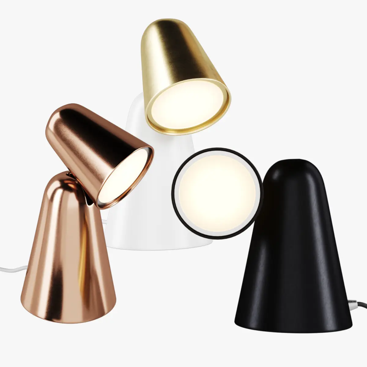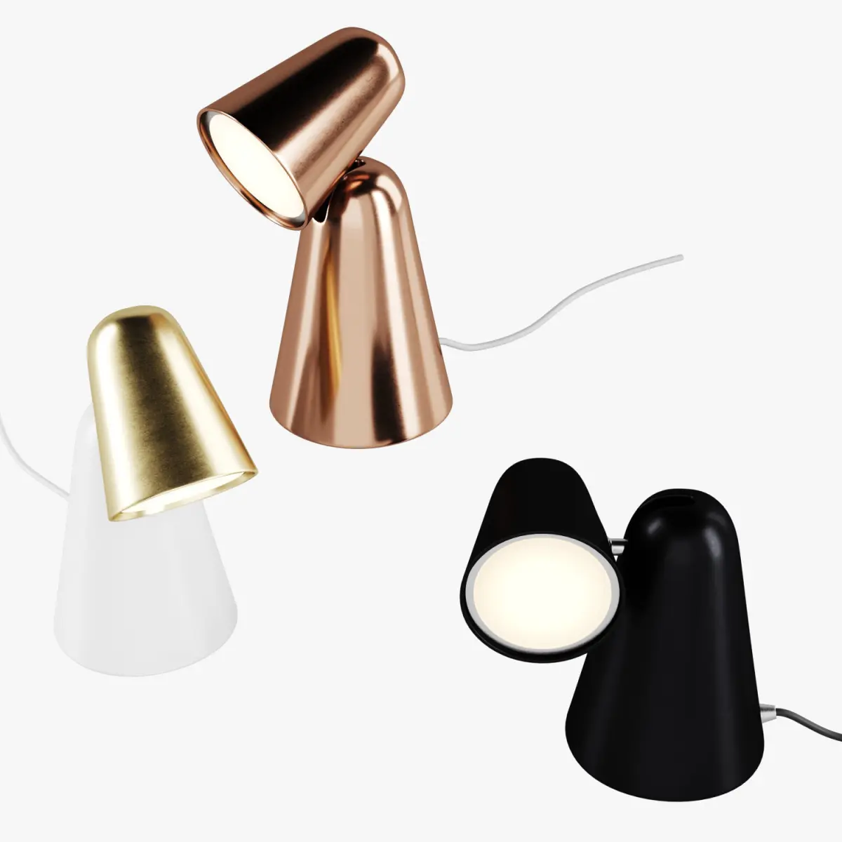 There are 3 lamps: white whith gold, black, cooper.