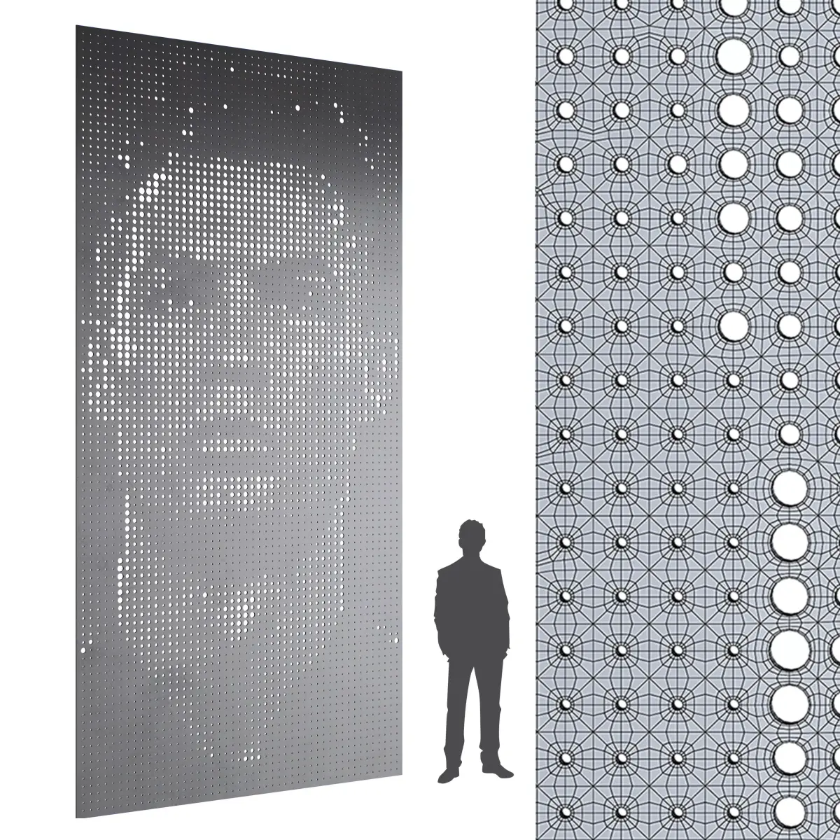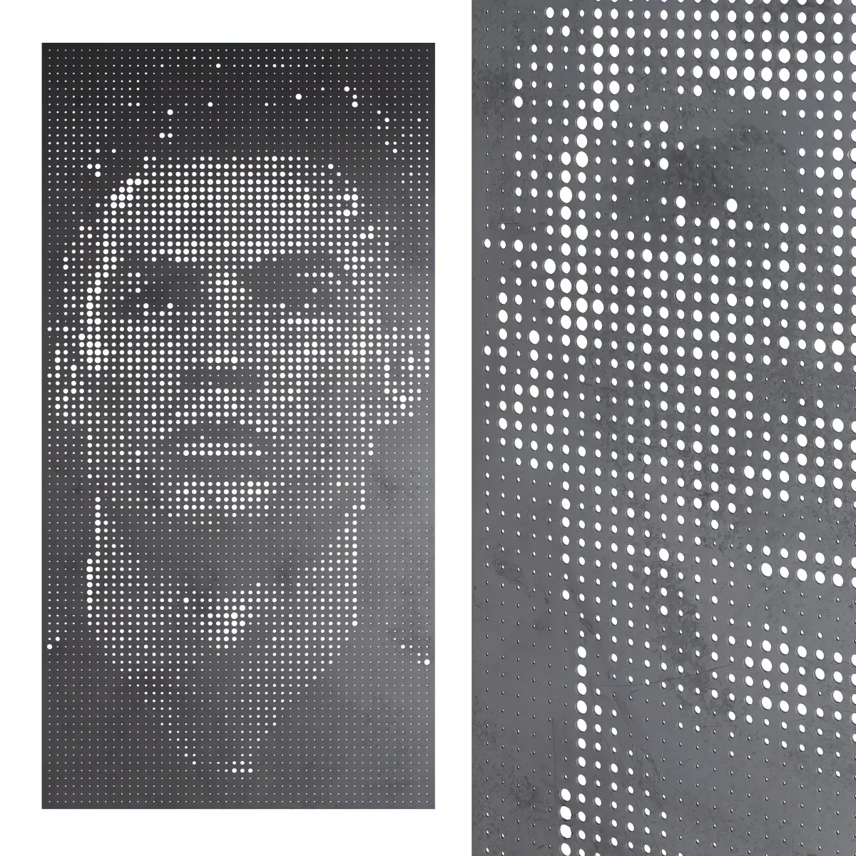 Design Concept: The portrait is embedded into the panel using a gradient perforation technique, where smaller holes create darker areas and larger openings form highlights. This method transforms the flat metal sheet into a visually dynamic piece of art.