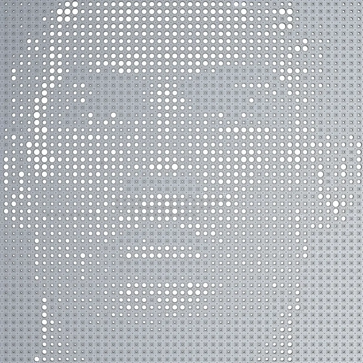 This 3D model represents a perforated metal panel featuring a portrait design created through a halftone dot pattern. The artwork is generated by varying the size and density of circular perforations across the surface, producing a striking visual effect when viewed from different angles and lighting conditions.
