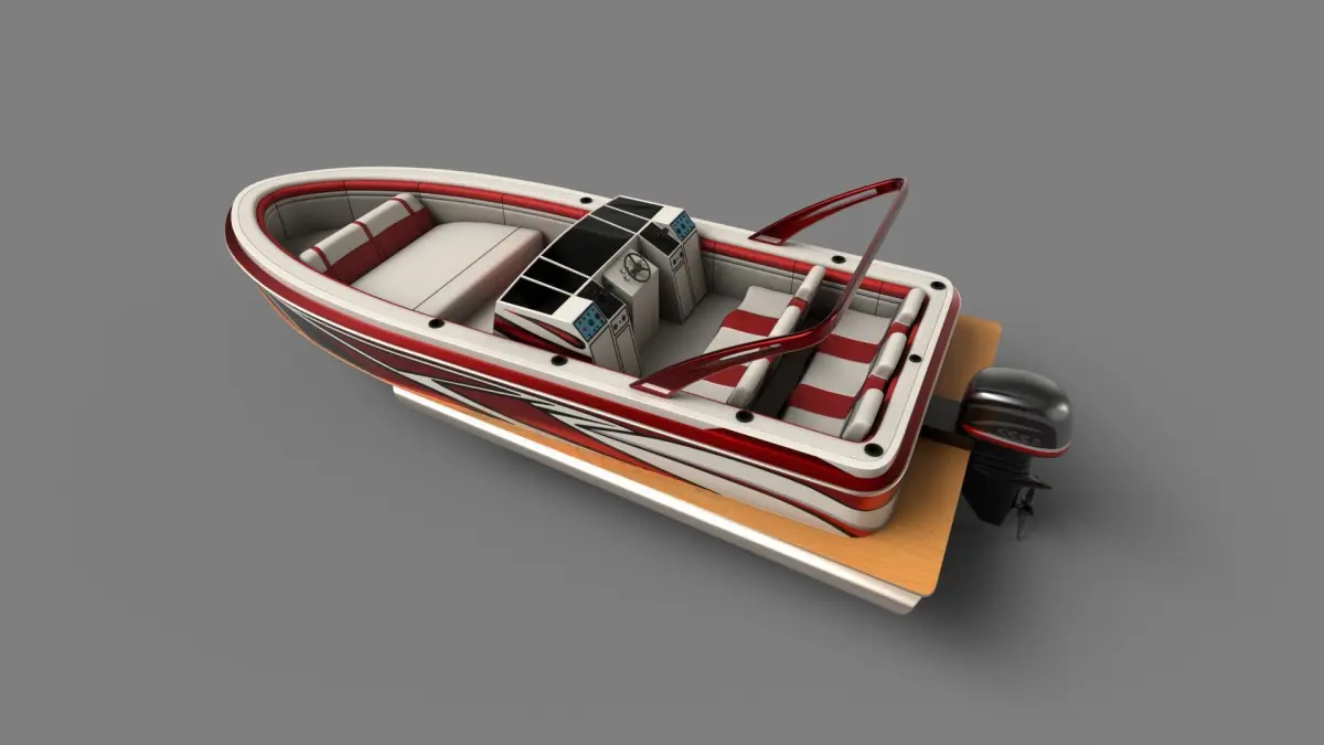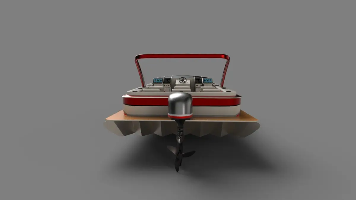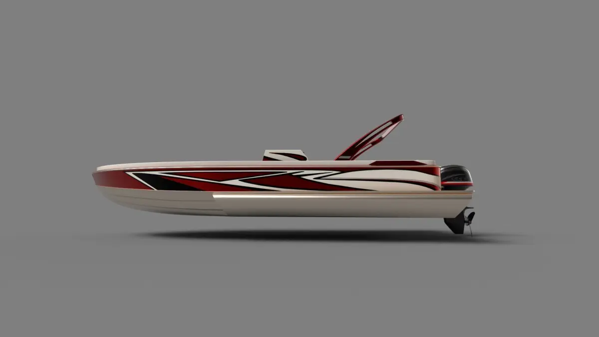 A sleek and modern performance pontoon boat designed for speed and agility on the water, featuring a bold red and white color scheme with racing stripes, aerodynamic shape, and a smooth fiberglass texture, perfect for adrenaline-filled watersports adventures in the historical era.