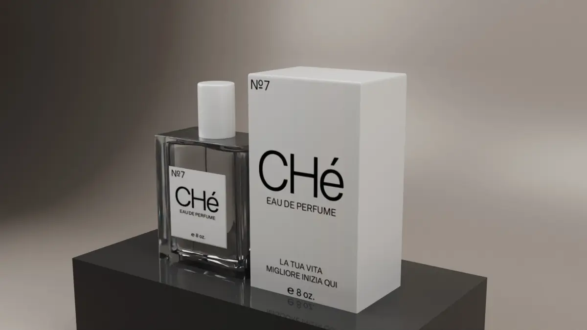 This is a high-quality 3D model of the CHé No7 Eau de Parfum bottle, perfect for product visualization, advertising, or cosmetic packaging projects. The design features a sleek rectangular glass bottle with a white label and matching cap, paired with a branded box that reads LA TUA VITA MIGLIORE INIZIA QUI (Your better life starts here). Modeled in clean geometry and low poly count for optimized performance, this asset is suitable for both close-up renders and real-time applications.