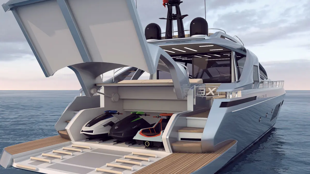 Facilities on boardThe 25.55-meter boat can comfortably accommodate up to 8 people in four cabins. Also on the lower deck there is a spacious garage for the tender Williams Sportjet 345 and a jet ski.