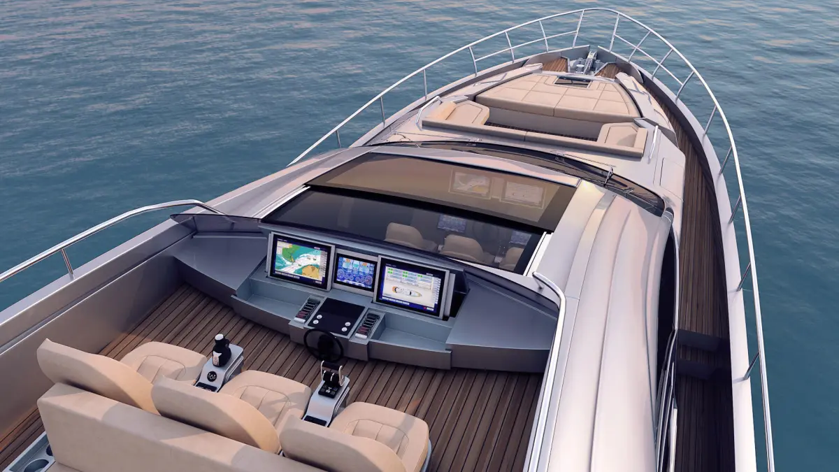 Exterior and interior designThe boat is an evolution of Pershing 82, it stands out with even smoother and sportier lines. Its bright design, like previous models, is due to the eminent studio Fulvio De Simoni. The yacht features large windows and plenty of open space. Interiors in bright colors are luxurious with notes of pragmatism.