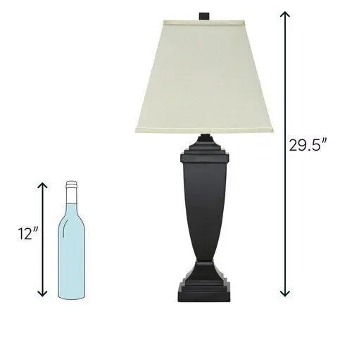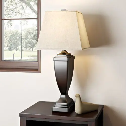 - Illuminate your space in curated, transitional style with this 30" table lamp! Crafted of Resin in a smooth dark bronze finish, this lamp strikes a streamlined urn-shaped silhouette on a tiered square pedestal base