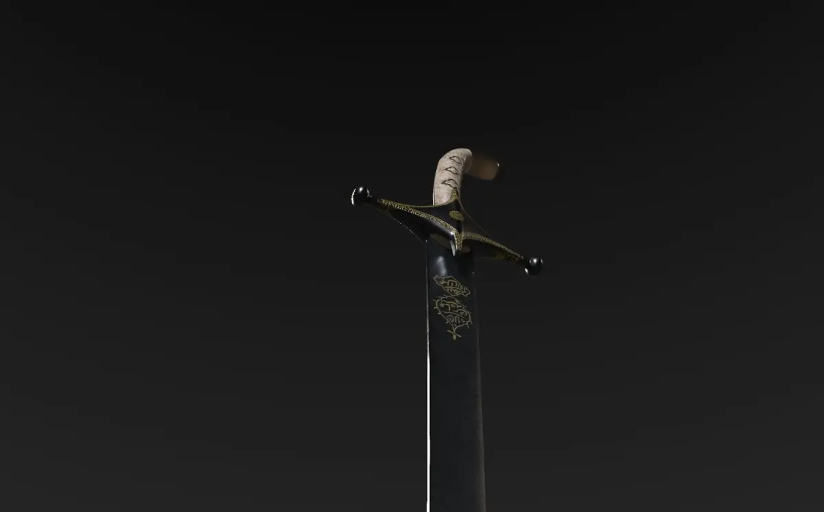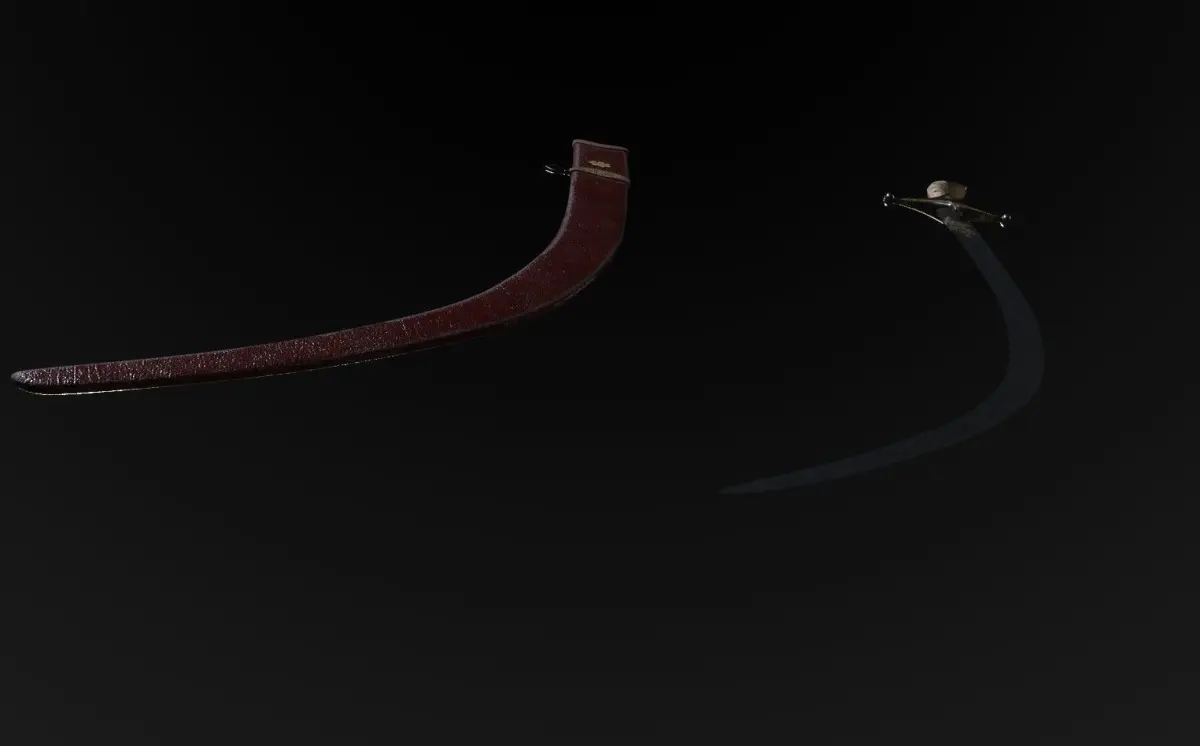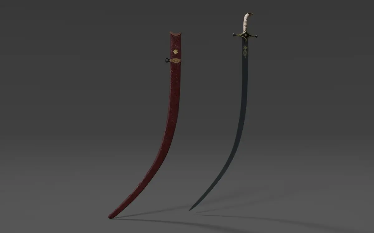 3D model of a Persian saber, late 18th century. Persia. There is a decorative design of the weapon and the brand of a gunsmith. Along with the saber there are leg ones.