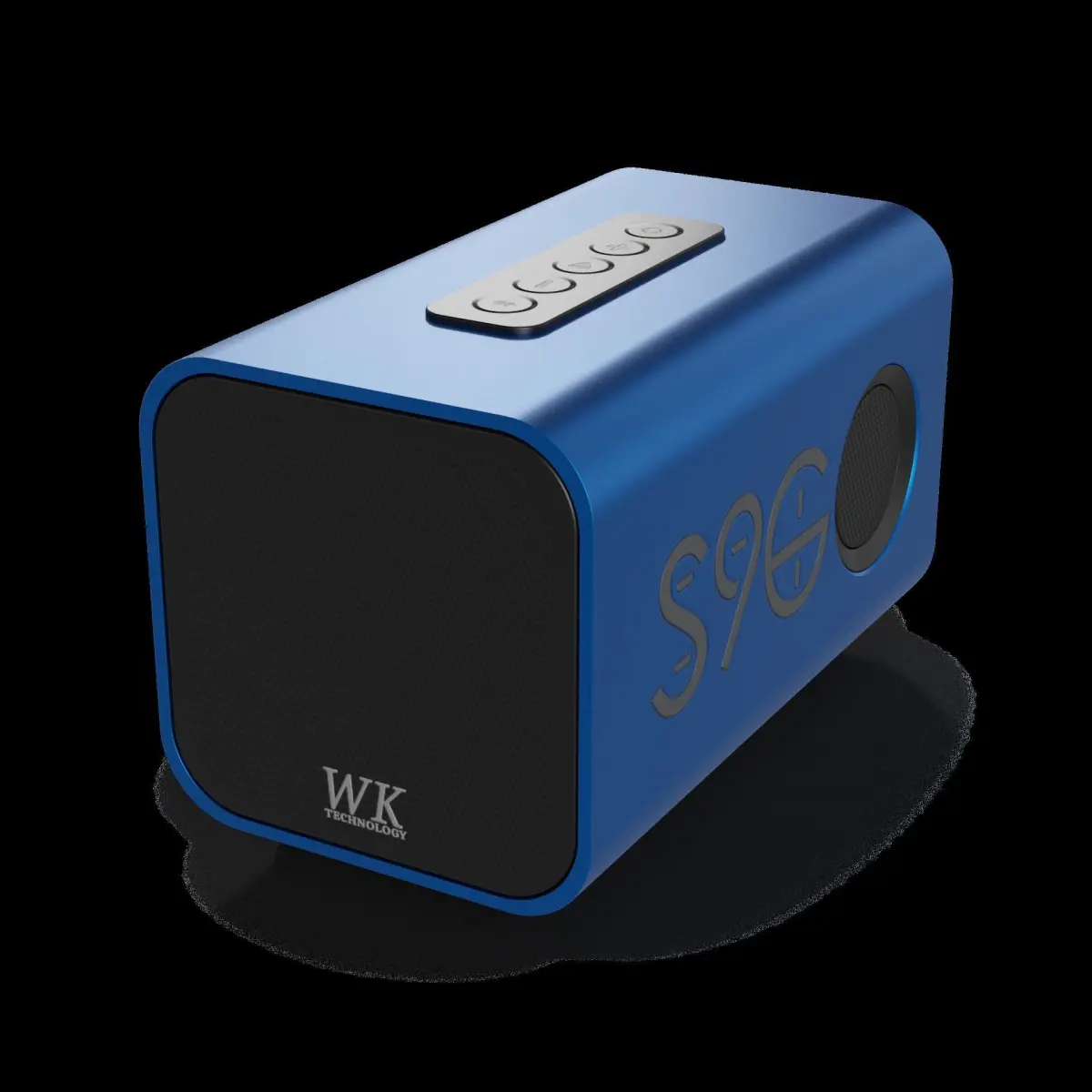 Bluetooth Speaker: A sleek, compact Bluetooth speaker that delivers powerful sound. The speaker is encased in a matte black, rubberized exterior, giving it a modern and stylish look. It comes in a rectangular box with a vibrant blue color scheme, featuring a graphic of the speaker on the front. The packaging includes a clear plastic window, allowing customers to see the speaker inside. The box also includes text labels indicating the speaker's features, such as wireless connectivity, long battery life, and built-in microphone for hands-free calling.