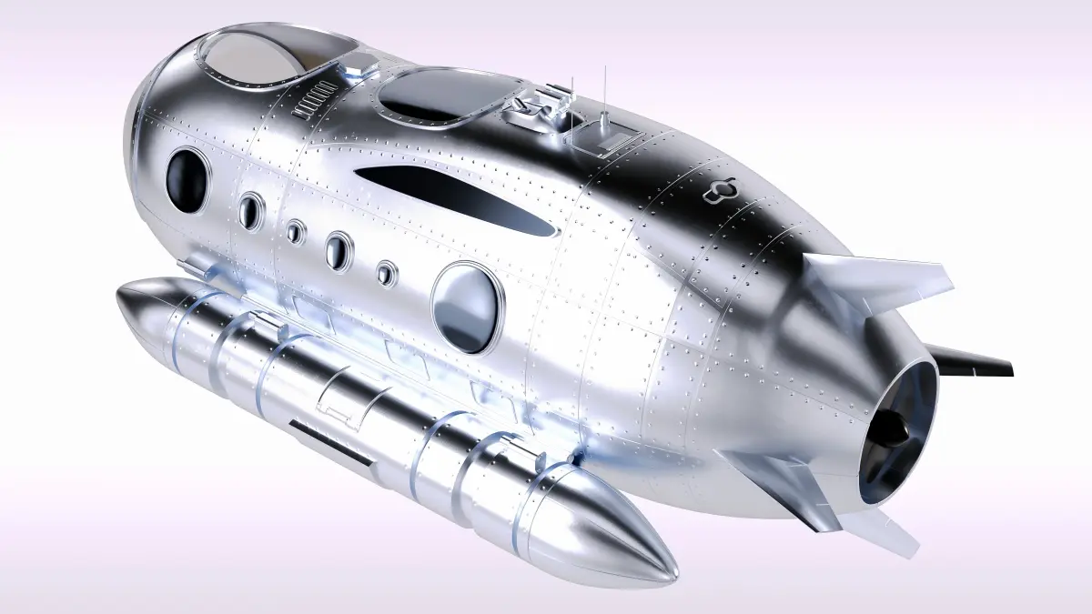 A modern personal submersible for civilians in the current era, boasting a striking metallic silver exterior with angular edges and a matte texture, complete with advanced navigation systems and comfortable seating for leisurely underwater exploration.