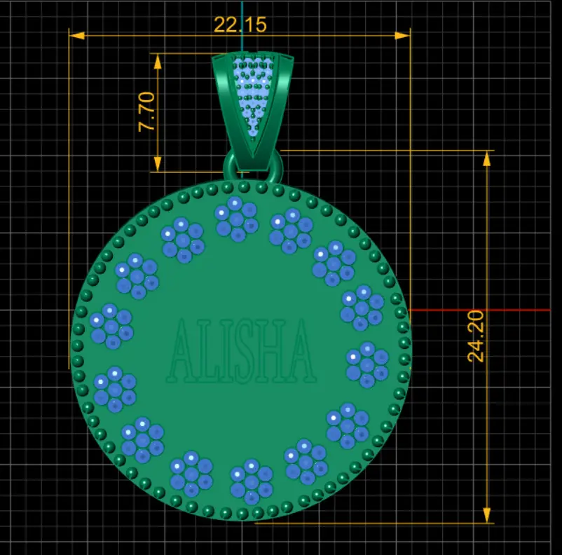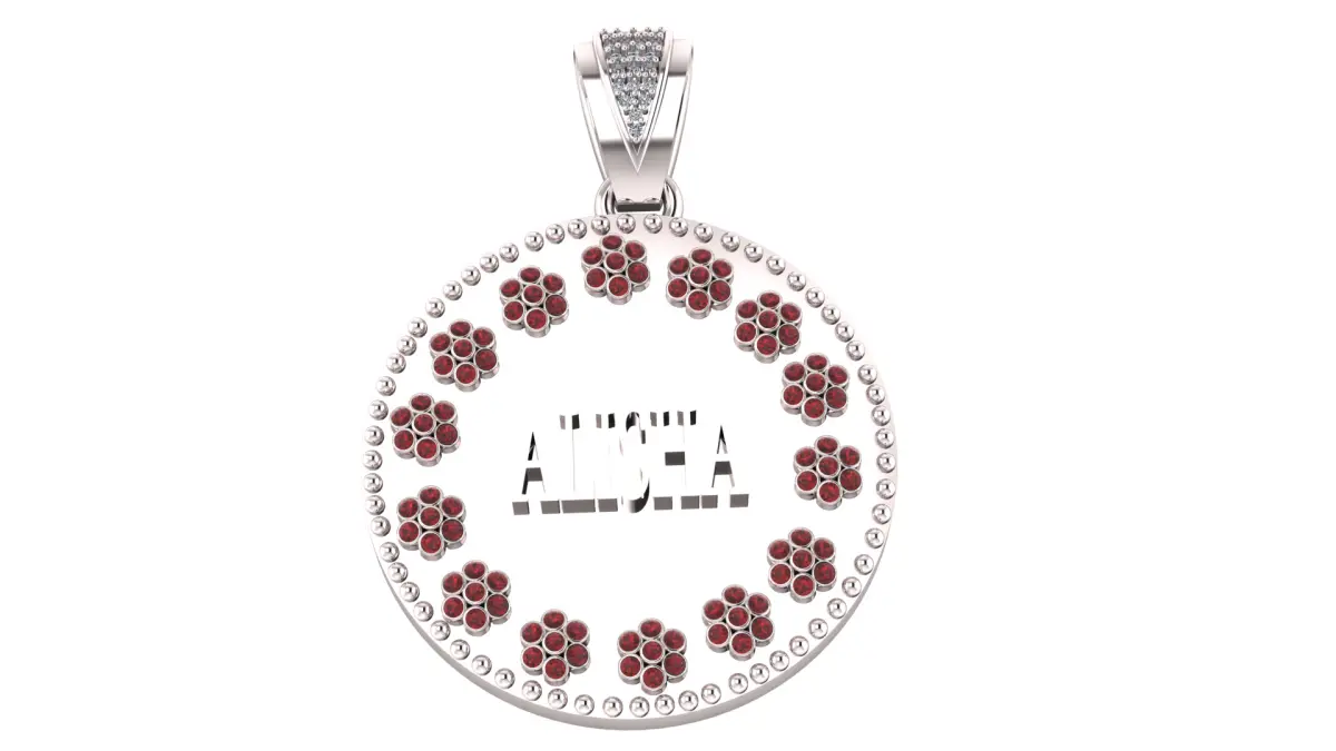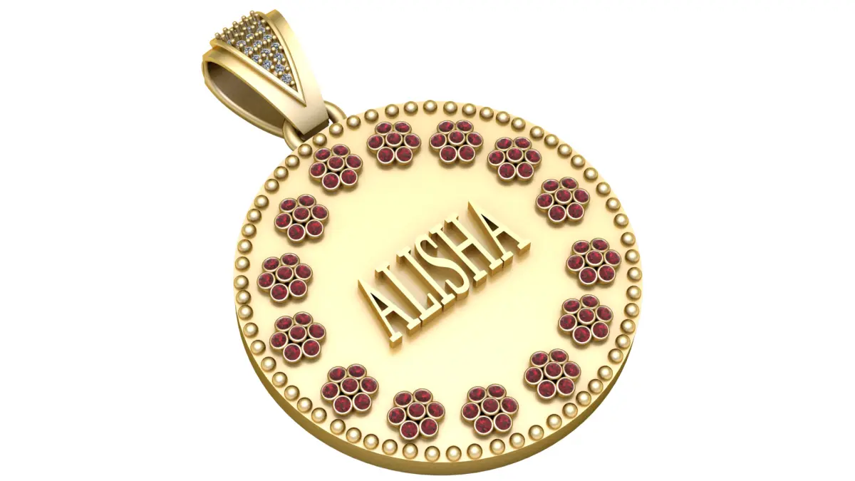 This elegant round pendant features a beautifully engraved 3D ALISHA name at its center, framed by a delicate border of polished gold beads. Surrounding the name are twelve intricately crafted floral clusters, each set with brilliant red ruby-like gemstones, adding a vibrant and luxurious touch. The diamond-studded bail completes the design, enhancing its sophistication and sparkle. Perfect for gifting or personal wear, this custom name pendant blends classic beauty with a personalized touch, making it a timeless keepsake.