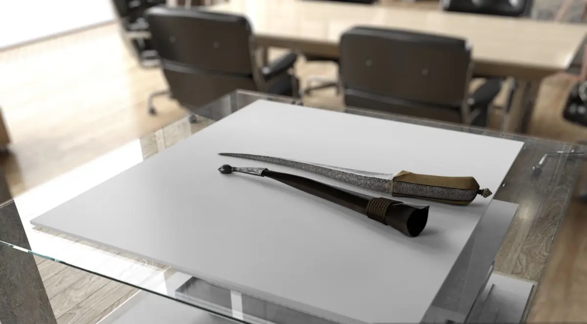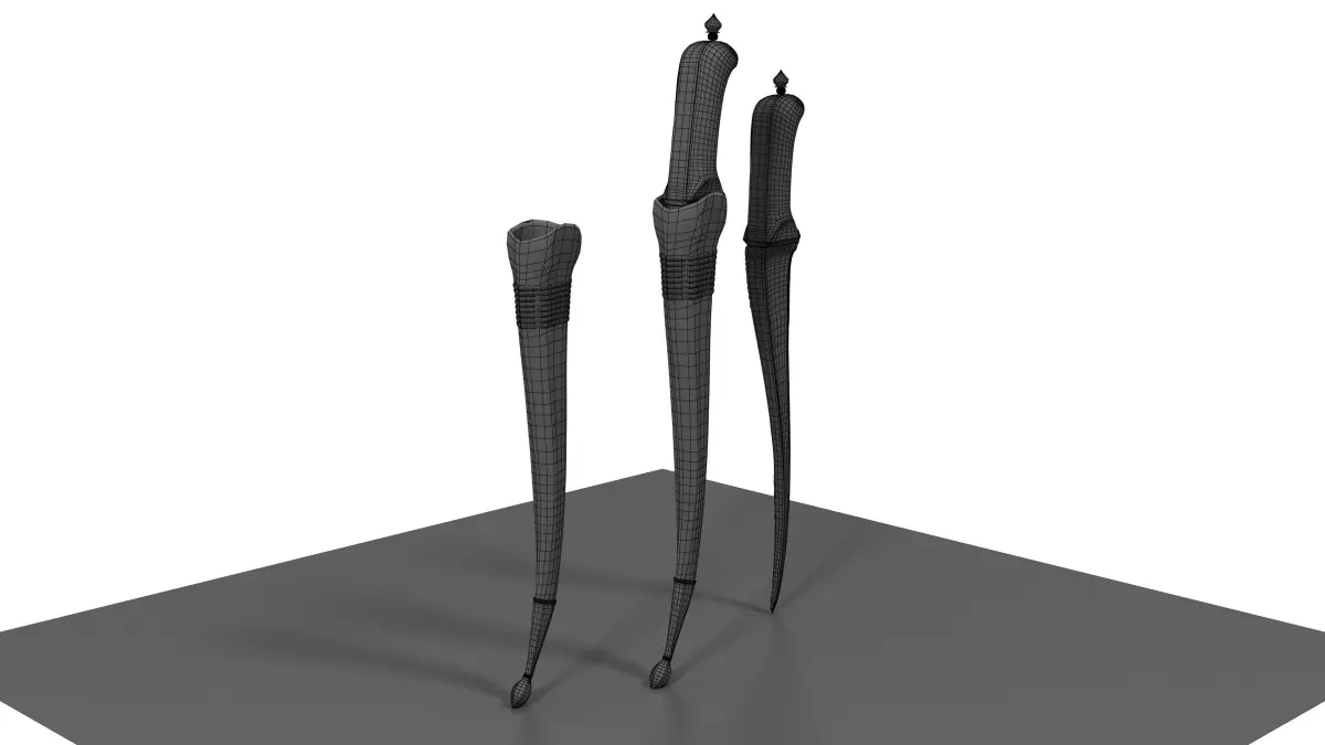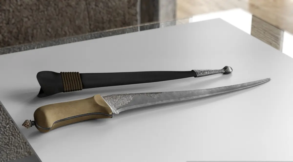 With recurved sharply-pointed blade very finely watered with Jacob's Ladder pattern and with bright reinforced cutting-edge, the spine of T-section chiselled over its entire length to the point with scrolling arabesques and foliage, the forte with a slightly raised shaped panel on each side chiselled en suite, beaked iron hilt en suite with the back of the blade along the top and inlaid in gold with foliate cartouches along the bottom, basal mount chiselled with arabesques and inlaid with gold foliage at the junction between the back of the blade and the grip, small gold-encrusted suspension swivel, and rounded walrus-ivory grips of plano-convex section, in original wooden scabbard covered in black leather (minor damage) with silver chape embossed and chased with foliage, and bound with its original suspension cord