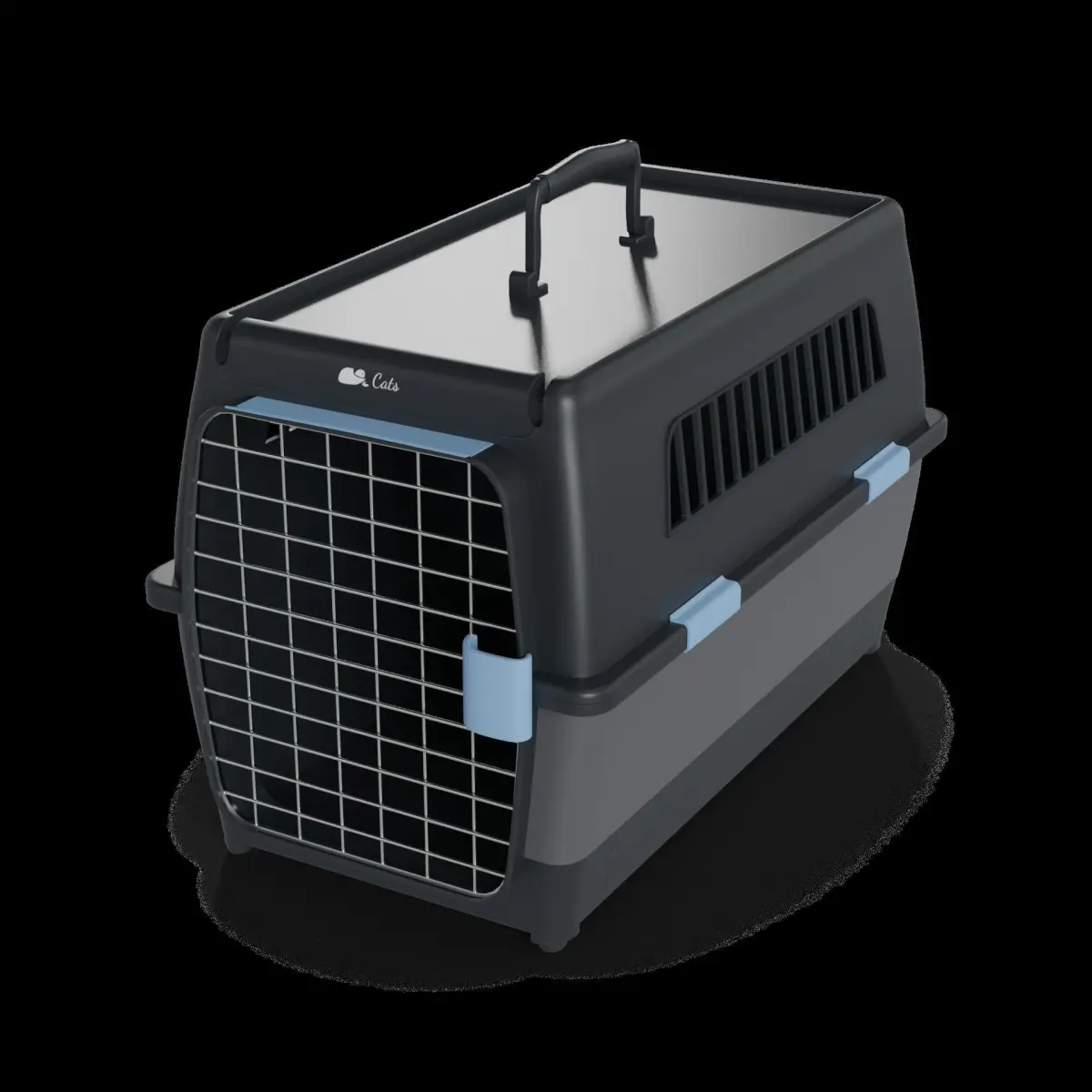 Pet Carrier: A sturdy and durable pet carrier made from high-quality plastic. The carrier has a top-loading design and features a secure locking mechanism. It comes in a sleek black color with a transparent door for visibility. The packaging includes a label with the text Pet Carrier and a graphic of a cat inside the carrier.