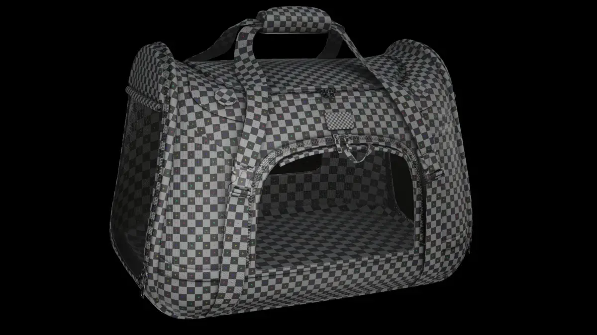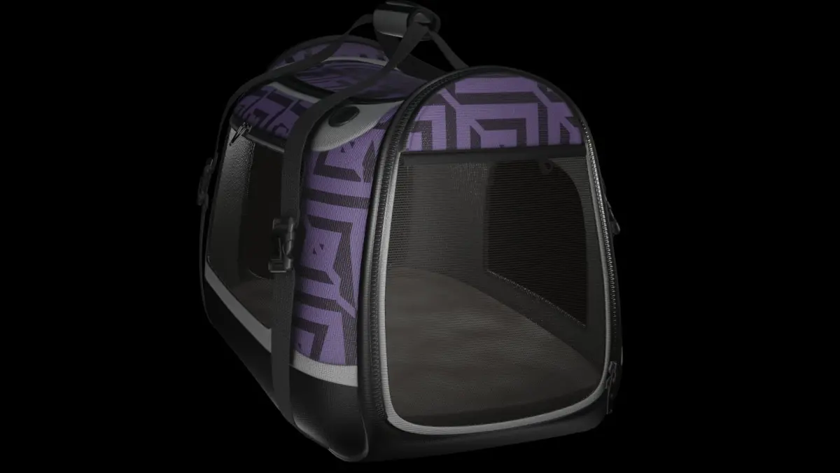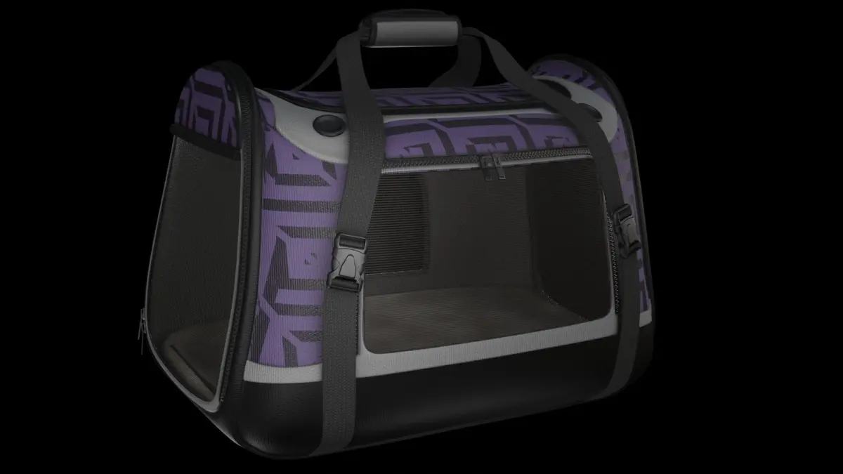 A sturdy and comfortable pet carrier made of durable fabric. The carrier has a mesh window for ventilation and a removable padded mat for added comfort. It comes in a sleek black color and has a top handle and an adjustable shoulder strap for easy transport. The packaging is a clear plastic bag with a label that says Pet Carrier and has a graphic of a pet inside the carrier.
