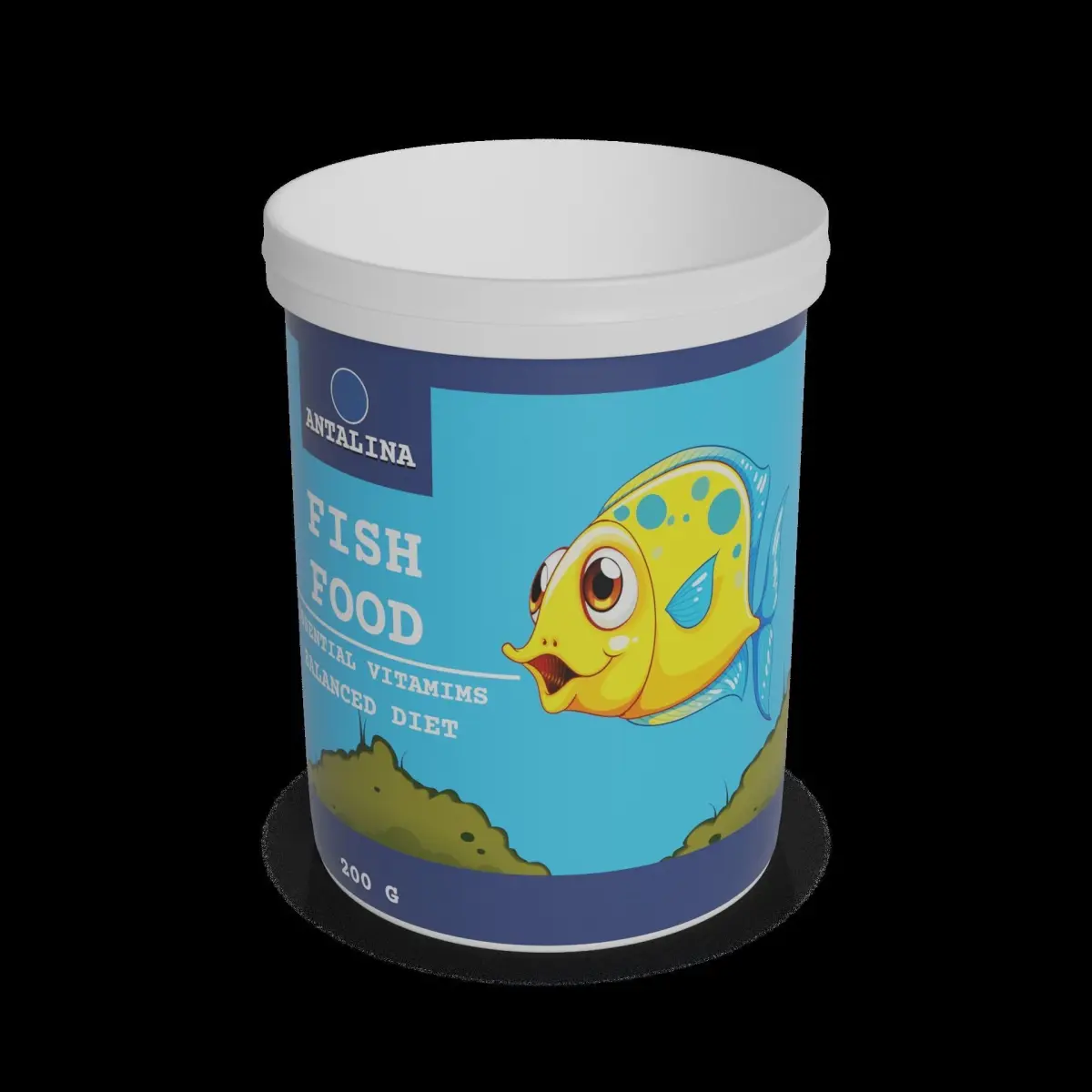 Fish Food: Ensure your fish stay healthy and vibrant with this high-quality fish food. The packaging comes in a sleek, rectangular plastic container, featuring a calming blue color scheme. The container holds 200 grams of nutritious fish flakes, sealed for freshness. The label includes text such as essential vitamins and balanced diet to inform customers about the product's nutritional value. A graphic of a colorful fish swimming happily adds a visual touch to the label.