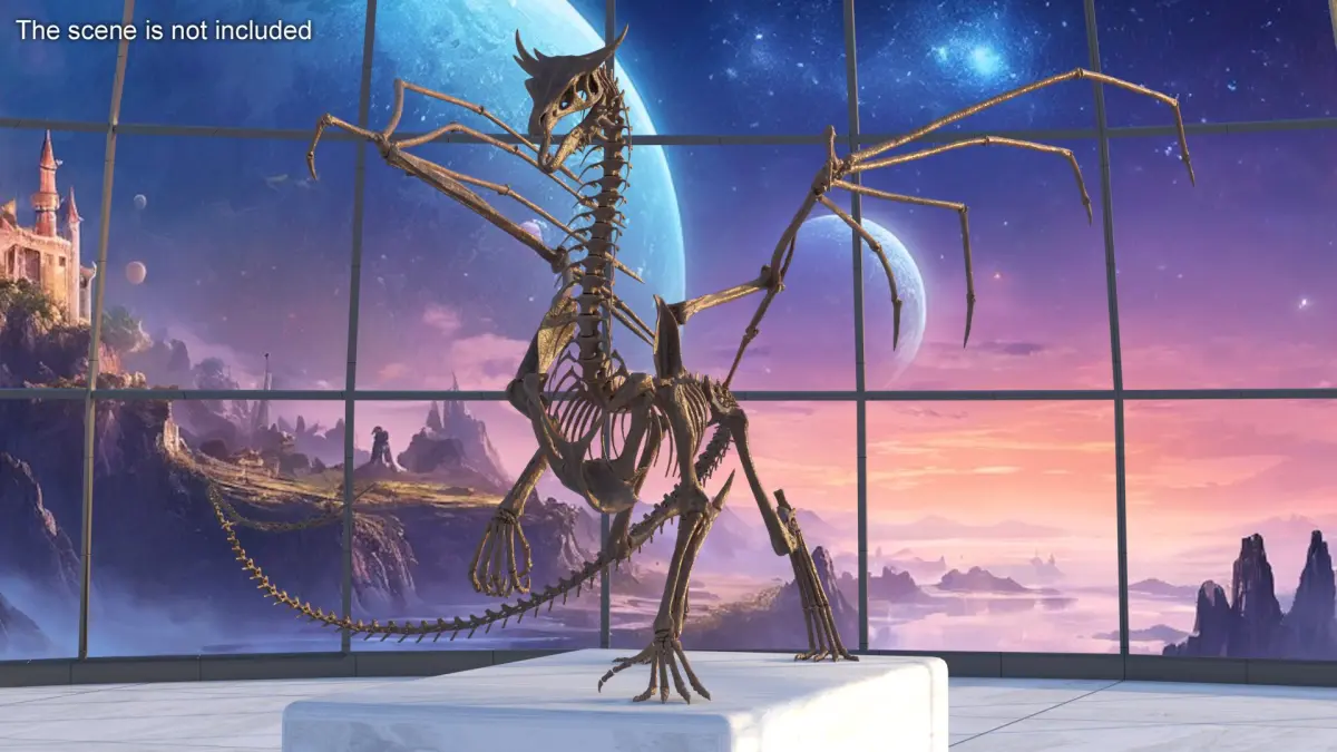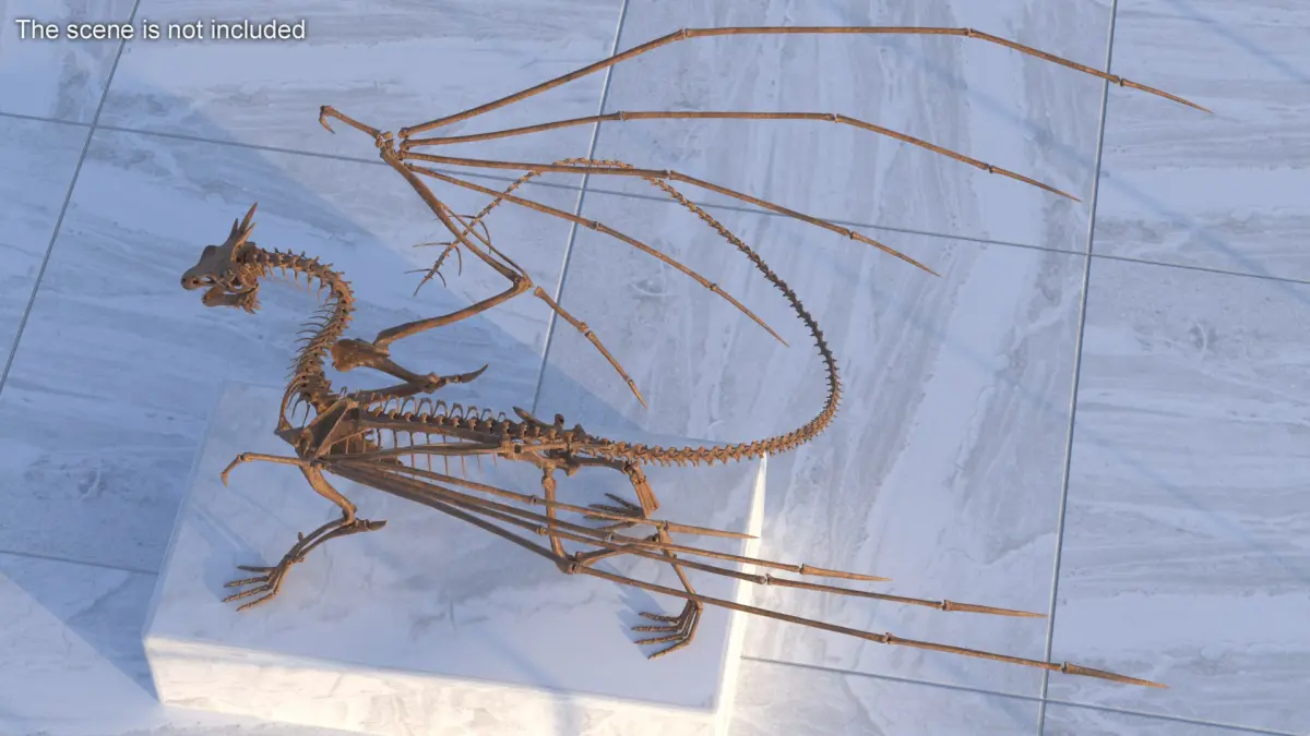 Petrified Dragon Skeleton Posed is a three-dimensional model of fantasy-style dragon skeleton that is a fossilized remains set, including the bones of a famous monster from folklore.