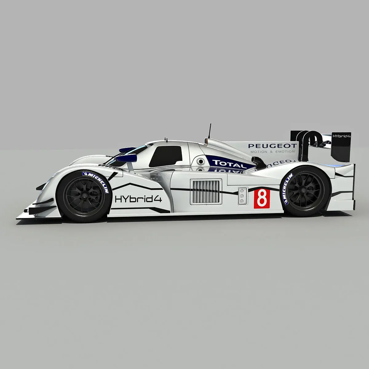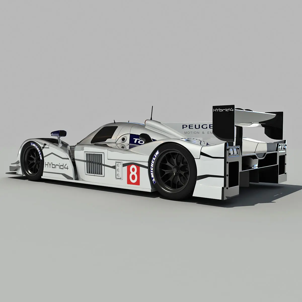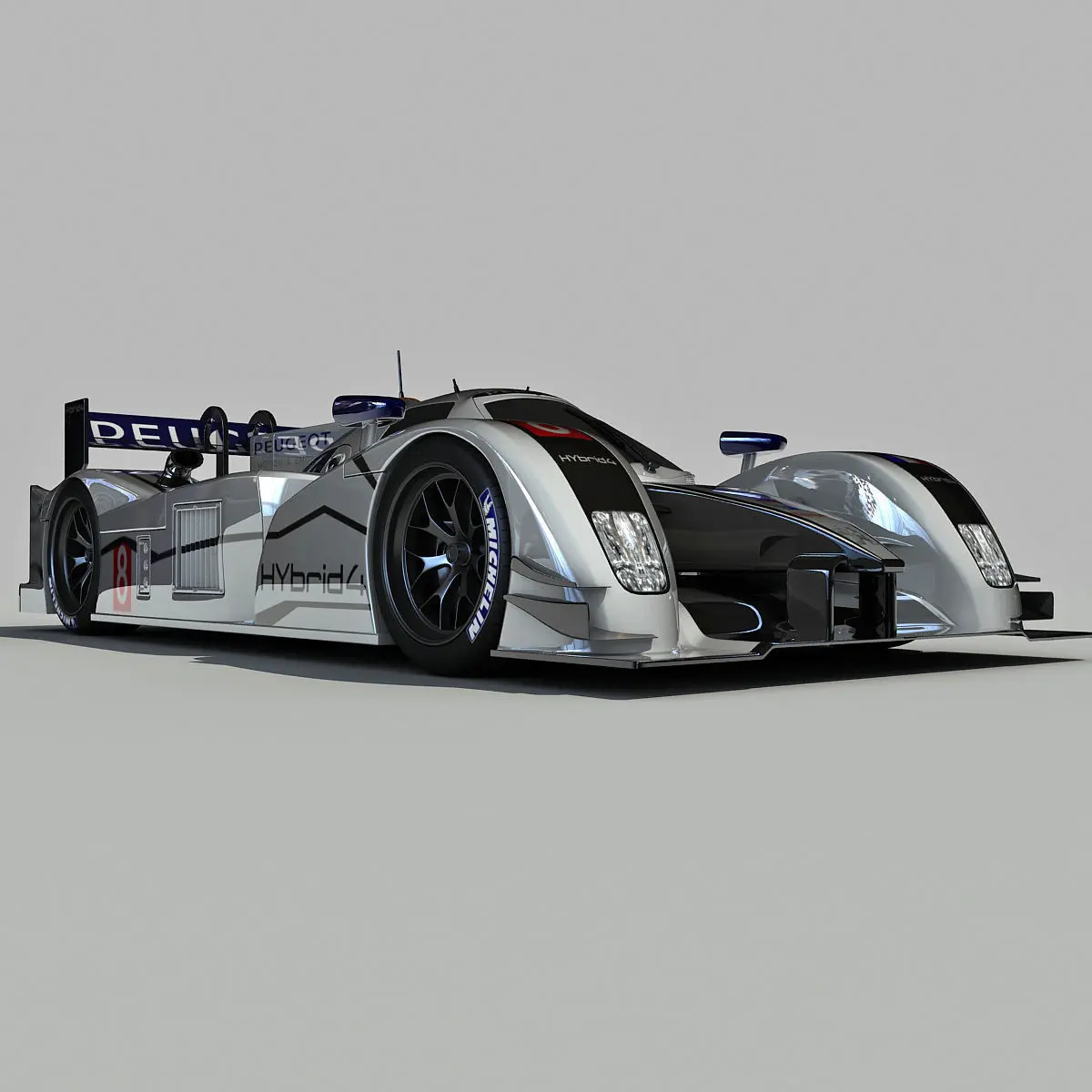 High-quality 3d model of Peugeot 908 Hybrid4 LMP1 Racecar.Textures are high resolution jpeg images (6144 x 6144) pix for main car, (2048 x 2048) pix for tyre.Colors can be easily modified.Materials might need to be re-assigned for other applications.HDRI map not included.Model is high resolution and perfect for close-up detailed renders.Previews rendered with V-Ray.