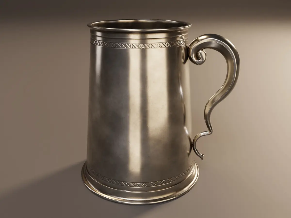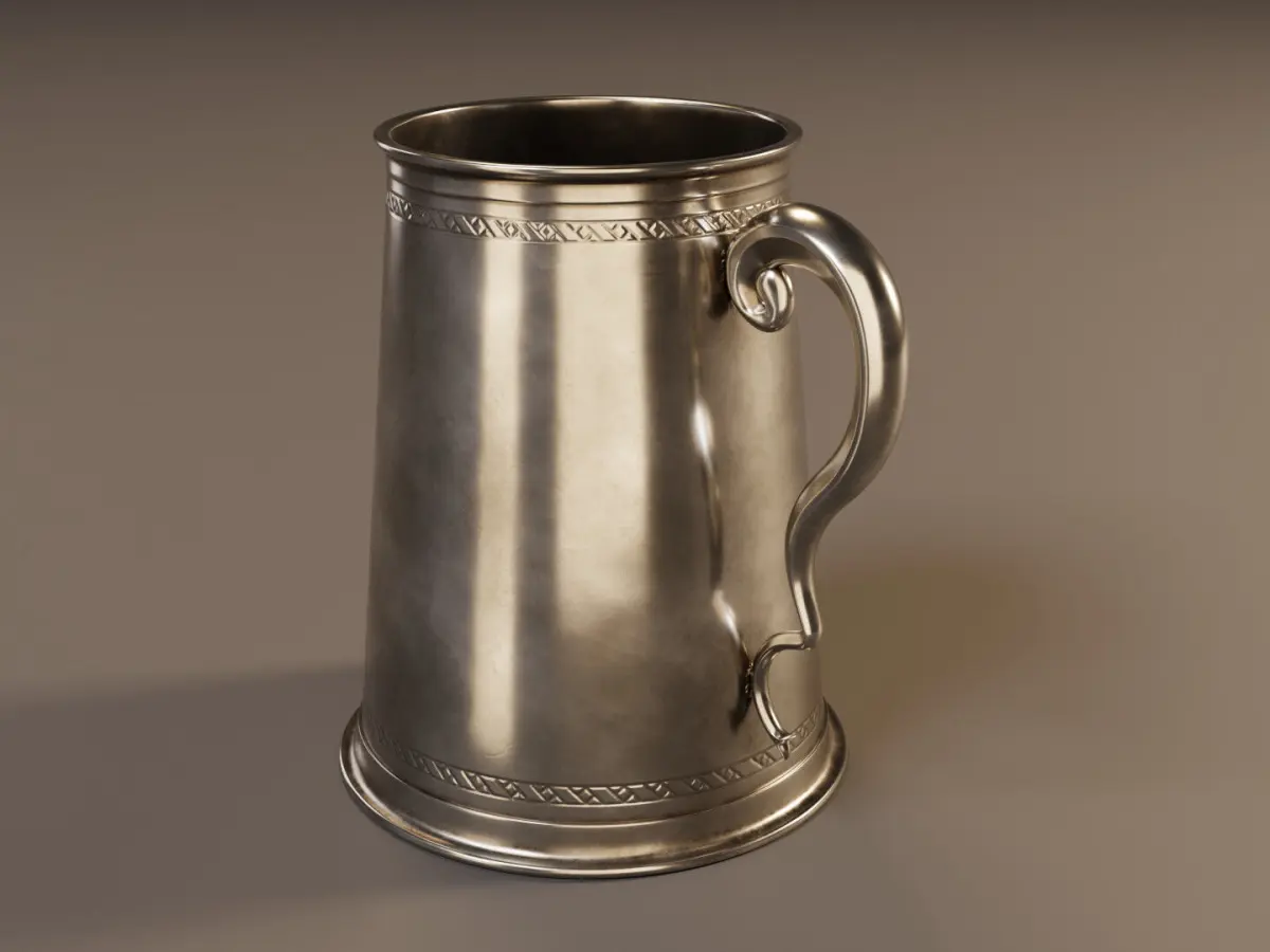 A model of a pewter tankard with minimal etching design, ideal for a medieval tavern scene.Renders done with 2 subdivision levels.