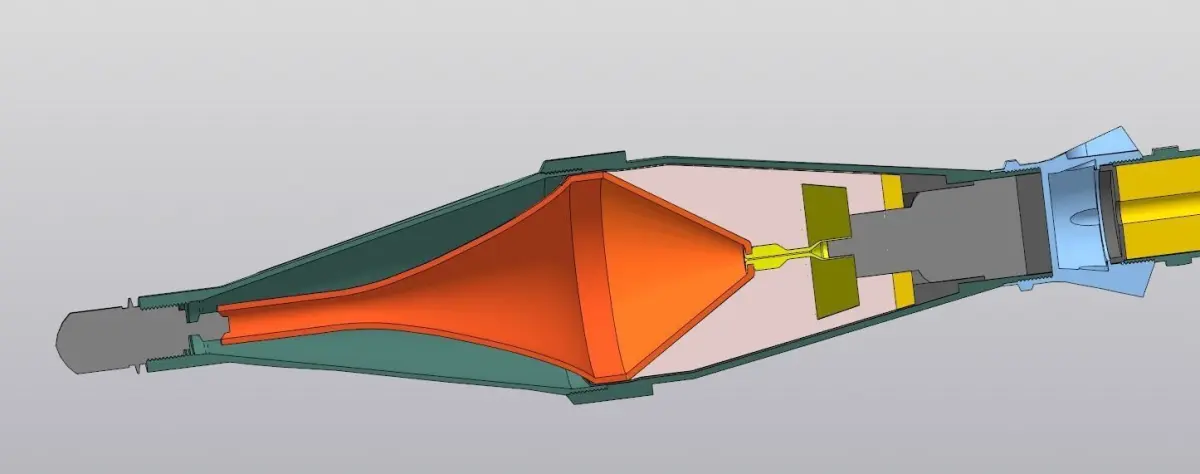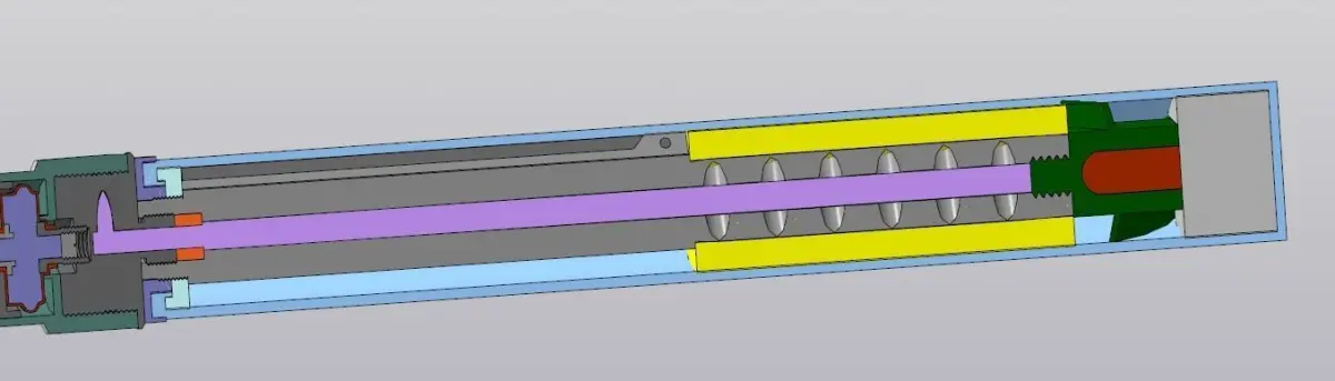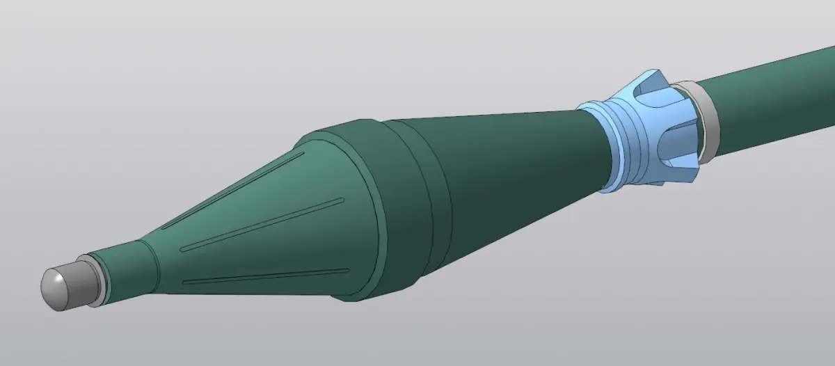 This is the Russian 85mm PG-7 (ПГ-7), a high-explosive anti-tank (HEAT), surface-to-surface, shoulder-launched, spin and fin stabilised rocket incorporating a Point Initiating Base Detonating (PIBD) with self-destruct (SD) fuzing system also made in various countries including Bulgaria and Iraq.The English-language term rocket-propelled grenade, though frequently encountered and reasonably descriptive, is a backronym for RPG (Ruchnoy Protivotankovyy Granatomyot, Hand-held anti-tank grenade launcher) and is not based on a literal translation.On firing, the flash from the percussion cap ignites a small gunpowder charge in the tail section spindle.This ignites the propellant strips surrounding the spindle, kicking the rocket out of the launcher and lighting the tracer.The acceleration is used to initiate the flight motor delay, which ignites the rocket motor after approximately 25m.On launch, the fuze arming sequence commences.