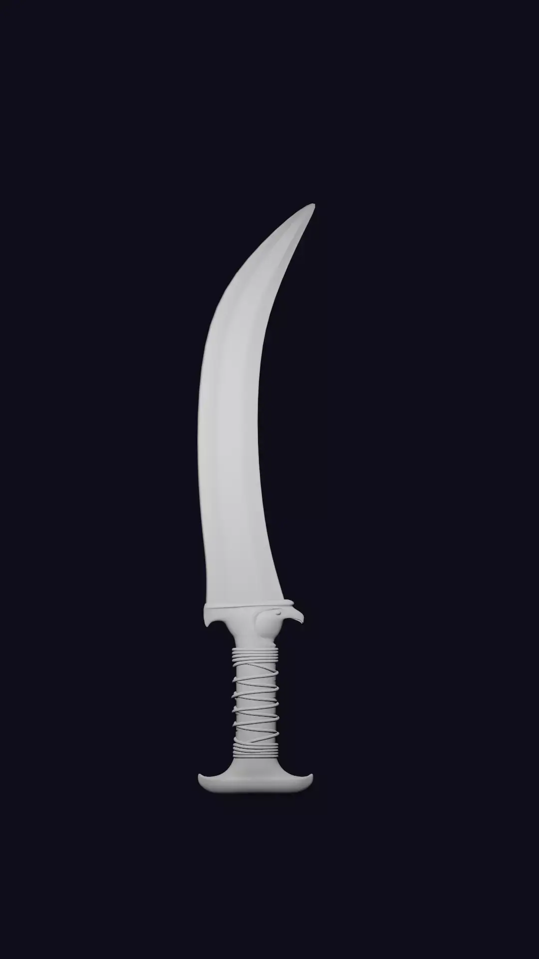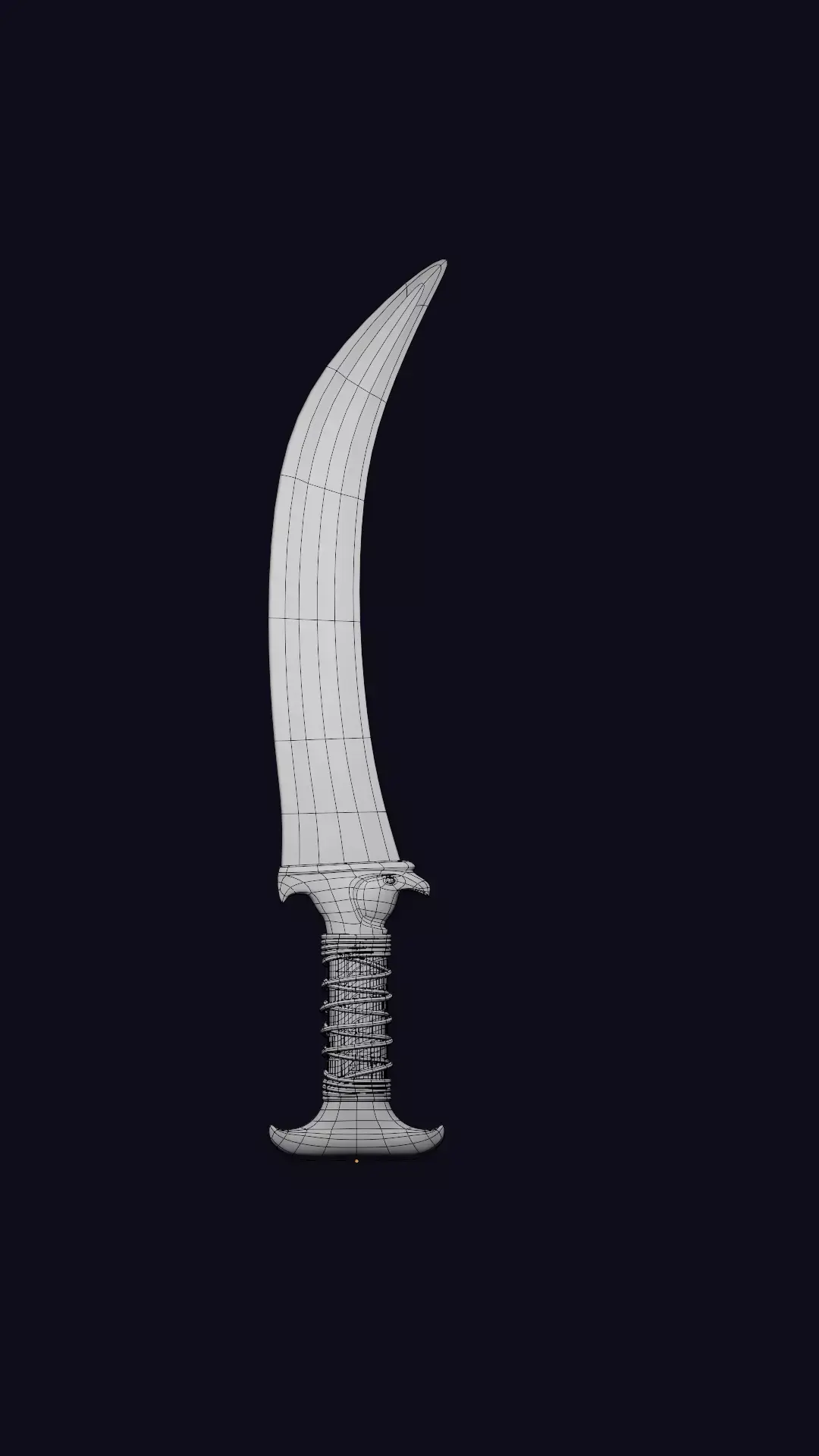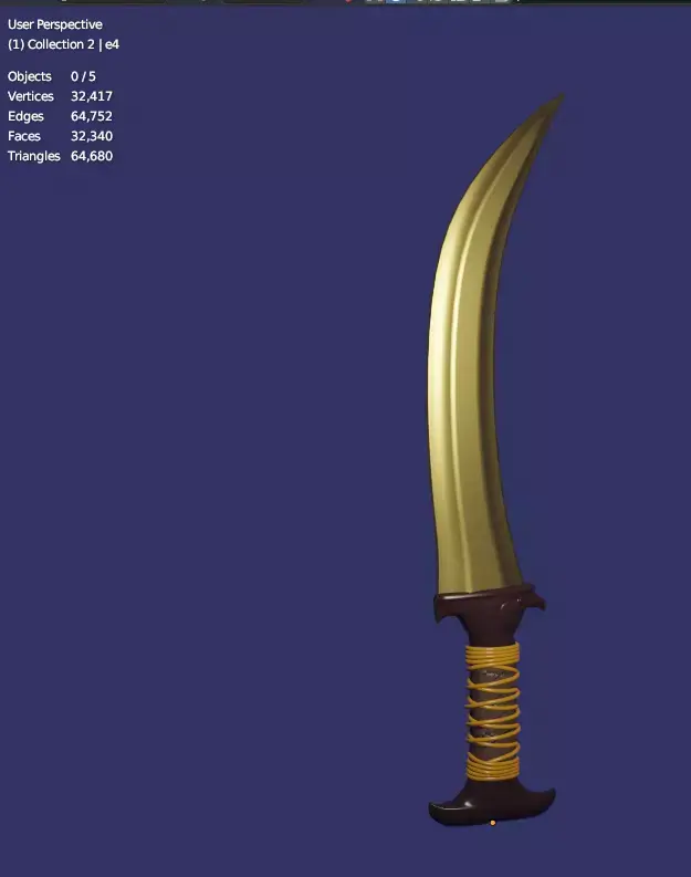 Description:We present a stunning, high-quality 3D digital model of a dagger inspired by the weapons and artistry of Ancient Egypt. Featuring a unique curved design and rich detailing, this asset is perfect for historical scenes, video game development, animations, or digital collectible art.Blade: A distinct, curved, sickle-like design (reminiscent of a Khopesh), rendered with a highly reflective gold material, mimicking the lustre of Old Kingdom treasures.Hilt: The guard is intricately sculpted in a dark material (deep brown/black) and features a prominent design of a Falcon Head (symbolizing the god Horus) on both sides, adding a powerful, spiritual touch.Grip: The handle is skillfully wrapped with vibrant orange/yellow cords or wires over a dark brown base, providing an authentic look and detailed texture.Quality: The model boasts excellent polygon detail (as shown by the wireframe and stats: 32,417 Vertices and 32,340 Faces), making it suitable for high-resolution close-ups and integration into game engines.Usage: Ready to import and use in 3D modeling software and artistic projects.Key Features:Ancient Egyptian-inspired design.Shiny golden blade and detailed Falcon-head hilt.Wireframe view included for quality assurance.Acquire this unique Pharaonic Dagger today and infuse your project with a touch of ancient royalty!