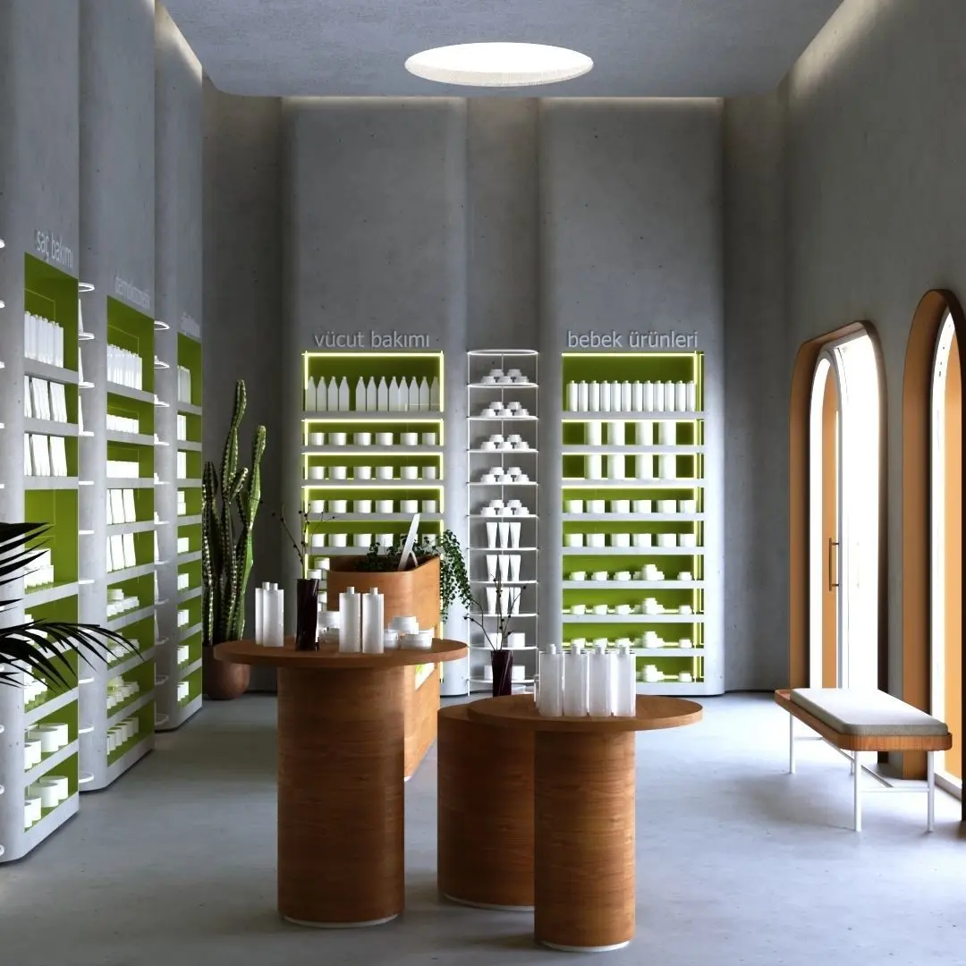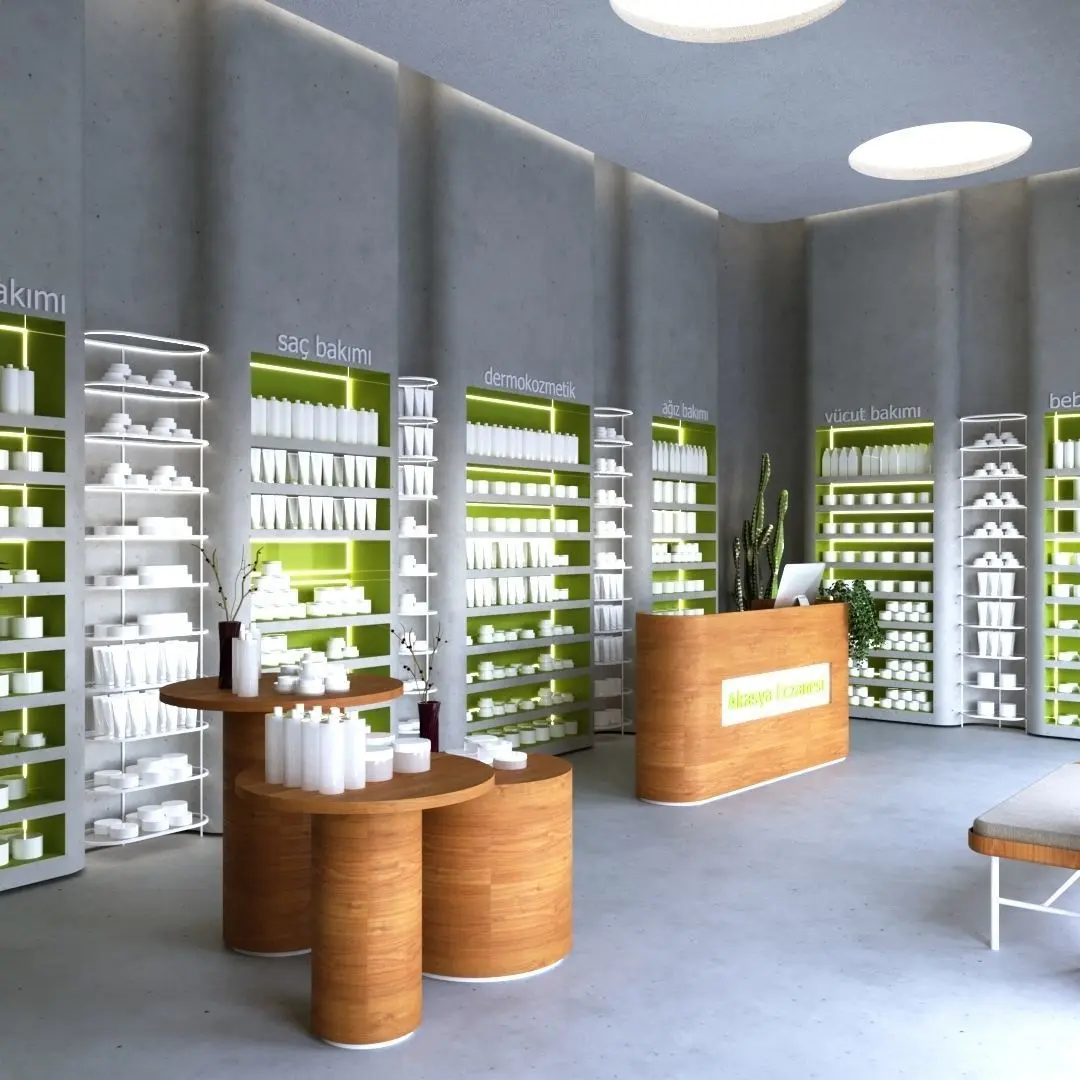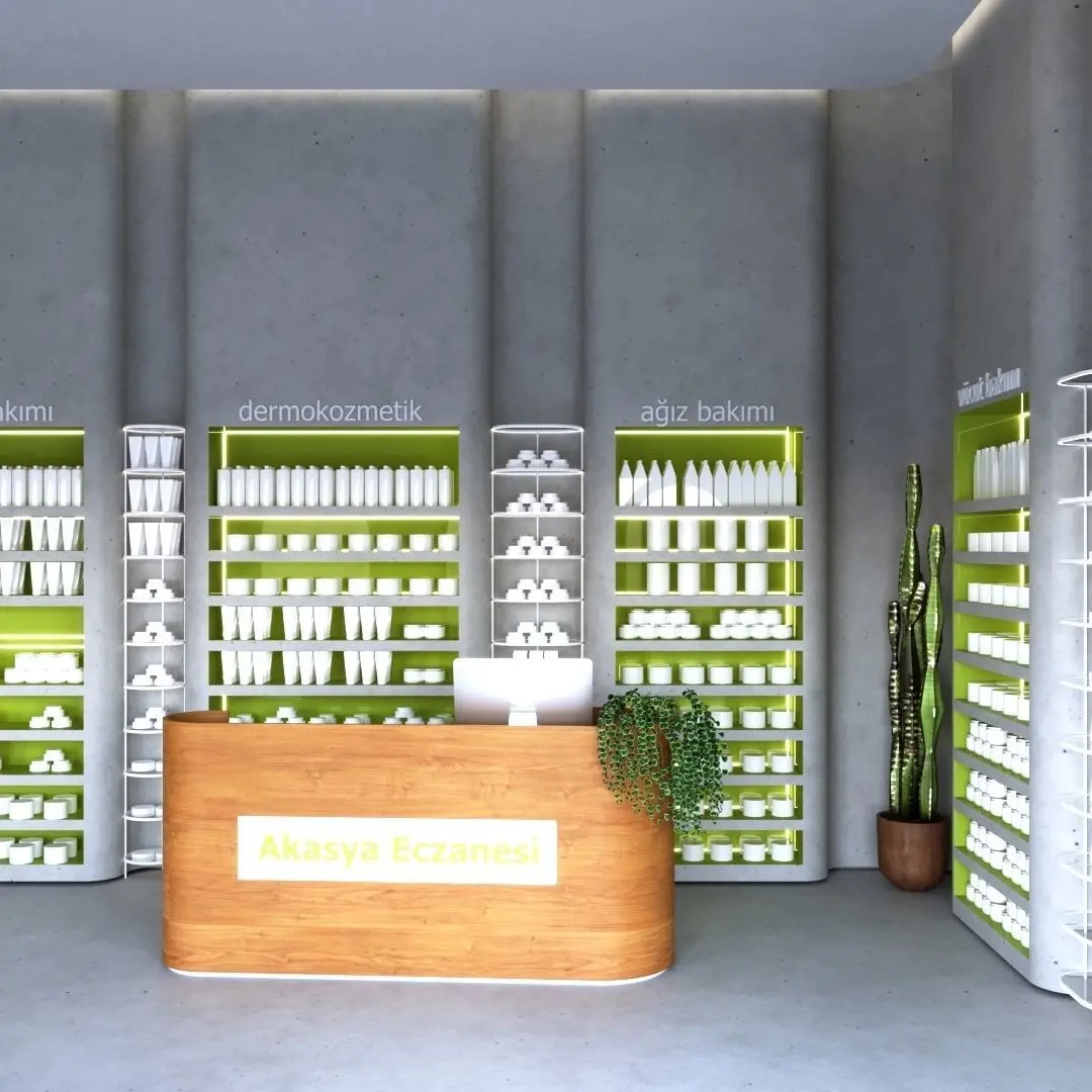 This model belongs to a pharmacy interior design project. It includes furniture designed for pharmacy interiors. It has been designed in many subjects from ceiling to floor.It also includes the subject of lighting.