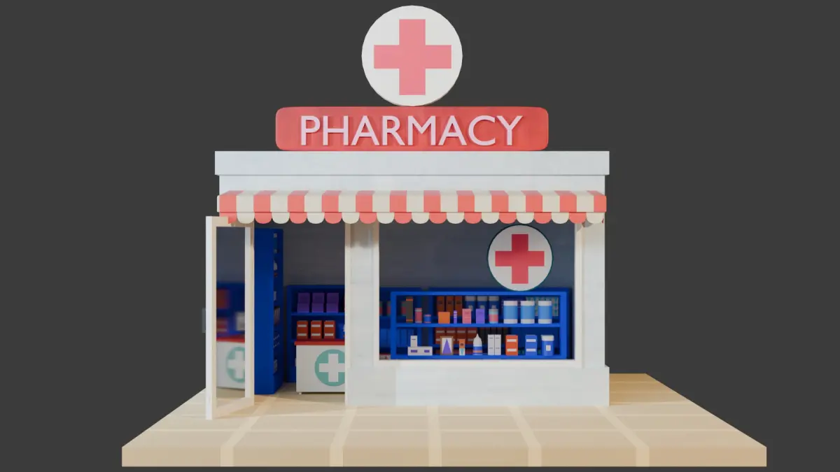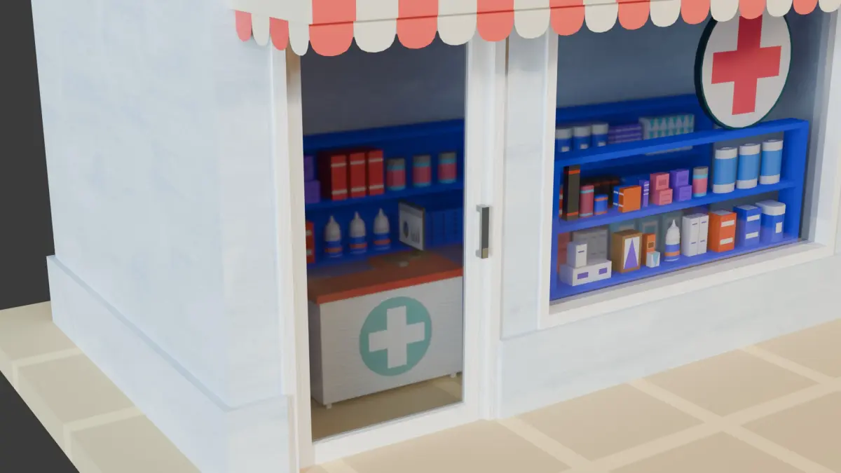 - Awning: A striped awning in matching red and white provides a welcoming exterior, adding to the pharmacy's approachable aesthetic.