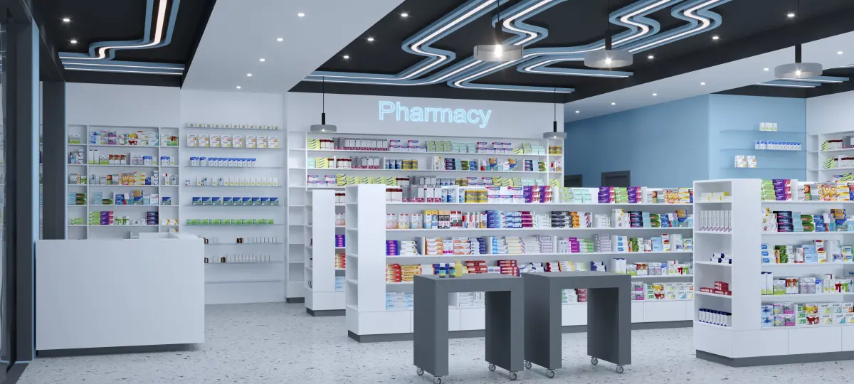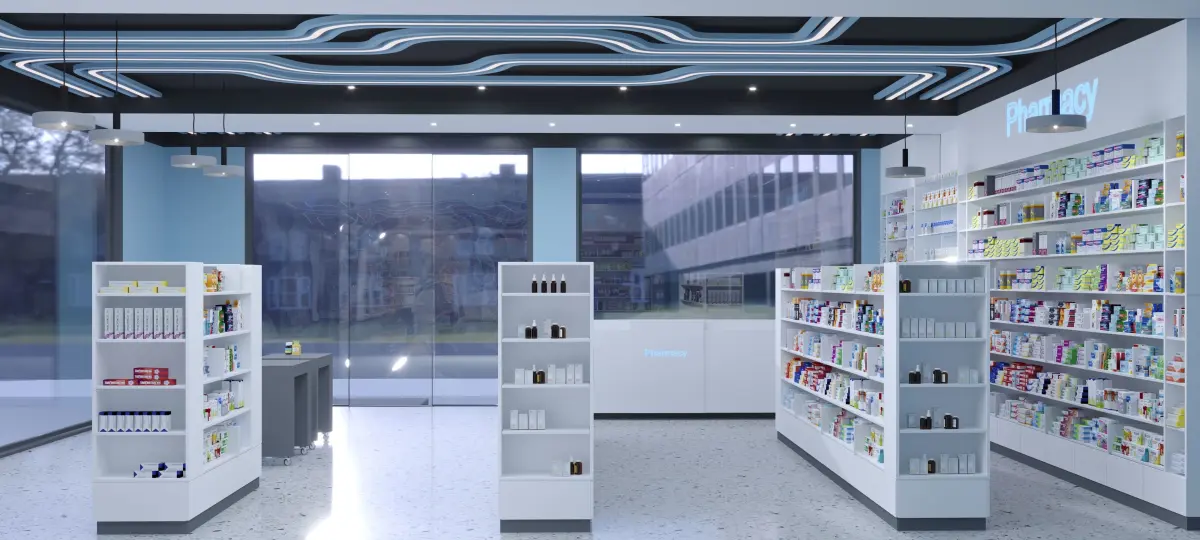 Interior design for a pharmacy that includes a large group of health care products. Interior design that serves your ideas and you can use it in your projects with complete freedom. There are different types of medicines and other products that can be normally found in a real pharmacy