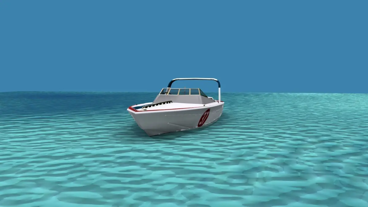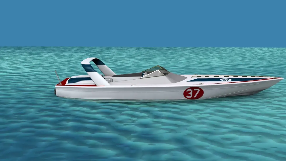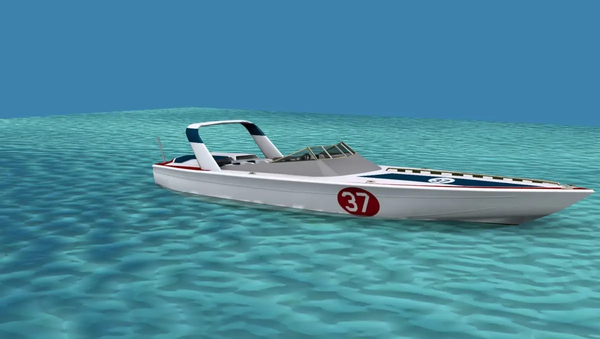 This is a fictional ocean going cigarette racing boat that would be popular with the wealthy racers or speed boat enthusiast. It has twin engines driving two water jets and seats for six. The fore cabin entry is modeled.