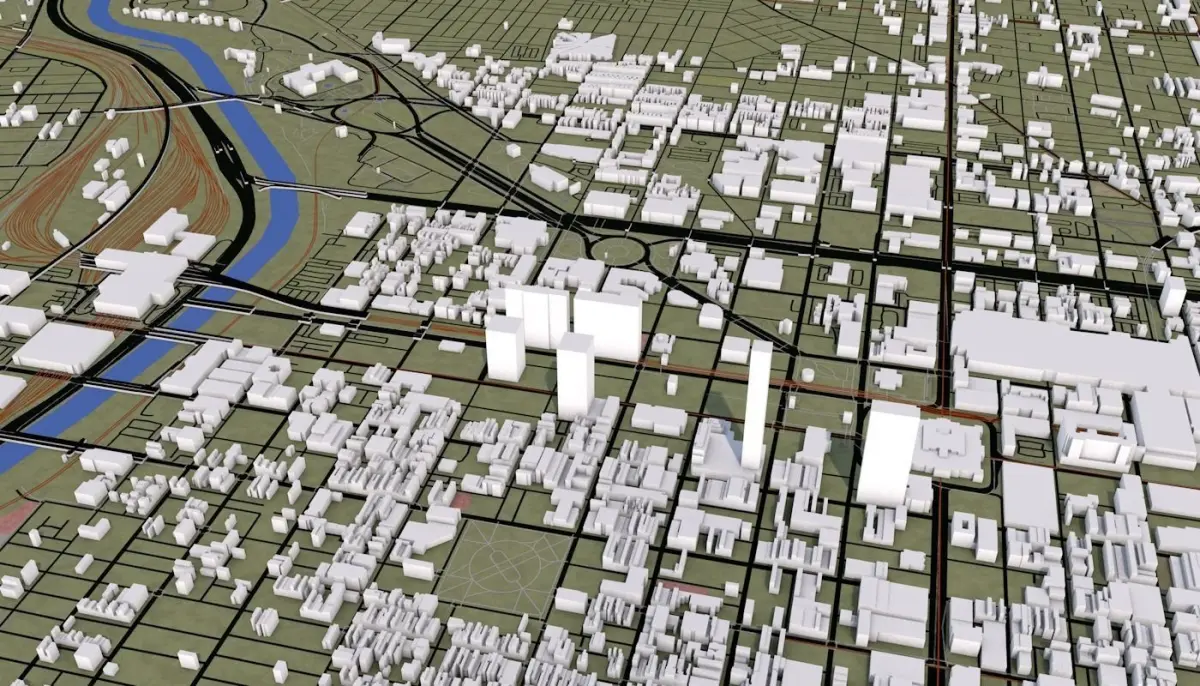 3D representation of Philadelphia City USA using 2019 map data. Roads, railway, land, water, buildings are made using real world data. Buildings are accurately placed and resembles the real world object up to some extend. Please note that random buildings (varying height) are added to those area where real world data is not available.