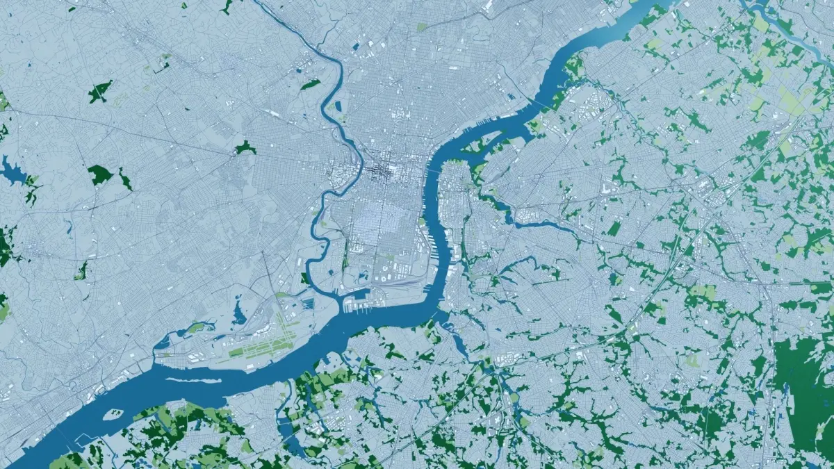 This is a 2019 OSM map version of a full Philadelphia city and surroundings, including terrain