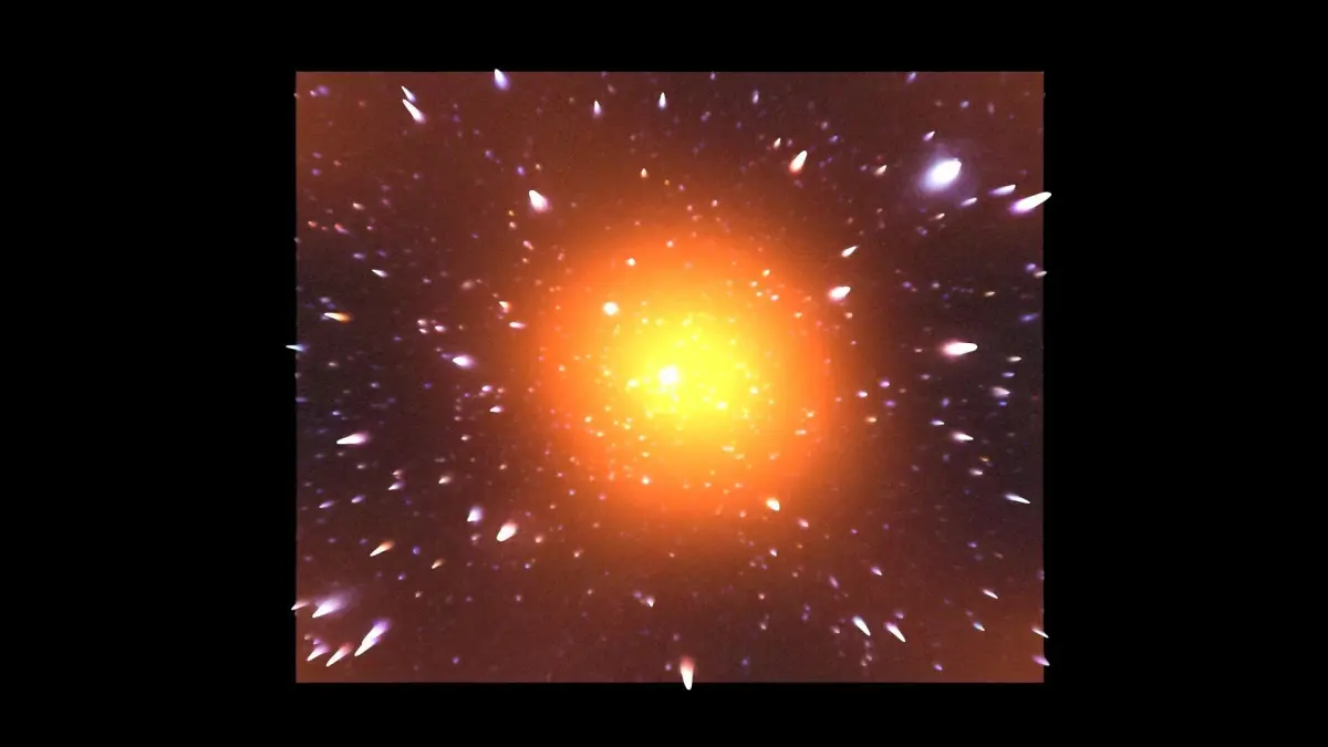 DescriptionPhoenix Cluster. The Phoenix Cluster is like a orange bright star. The Phoenix Cluster (SPT-CL J2344-4243) is a massive, Abell class type I galaxy cluster located at its namesake, southern constellation of Phoenix. It was initially detected in 2010 during a 2,500 square degree survey of the southern sky using the Sunyaev–Zeldovich effect by the South Pole Telescope collaboration. It is one of the most massive galaxy clusters known, with the mass on the order of 2×1015 MO, and is the most luminous X-ray cluster discovered, producing more X-rays than any other known massive cluster. It is located at a comoving distance of 8.61 billion light-years (2.64 gigaparsecs) from Earth. About 42 member galaxies were identified and currently listed in the SIMBAD Astronomical Database, though the real number may be as high as 1,000 galaxies. The Phoenix Cluster was first reported in a paper by R. Williamson and colleagues during a survey by the South Pole Telescope in Antarctica, being one of the 26 galaxy clusters identified by the survey. The detection has been conducted at frequencies between 95, 150, and 220 GHz, with 14 of the galaxy clusters detected have been previously identified, while 12 – including Phoenix Cluster, being new discoveries. The would-be named Phoenix Cluster (still identified by its numerical catalogue entry SPT-CL J2344–4243) has been remarked to be having the largest X-ray luminosity of any cluster described by the survey. A bright, type-2 Seyfert galaxy has also been pronounced lying 19 arcseconds from the apparent center of the cluster that has been identified as 2MASX J23444387-4243124, which would later be named Phoenix A, the cluster's central galaxy.