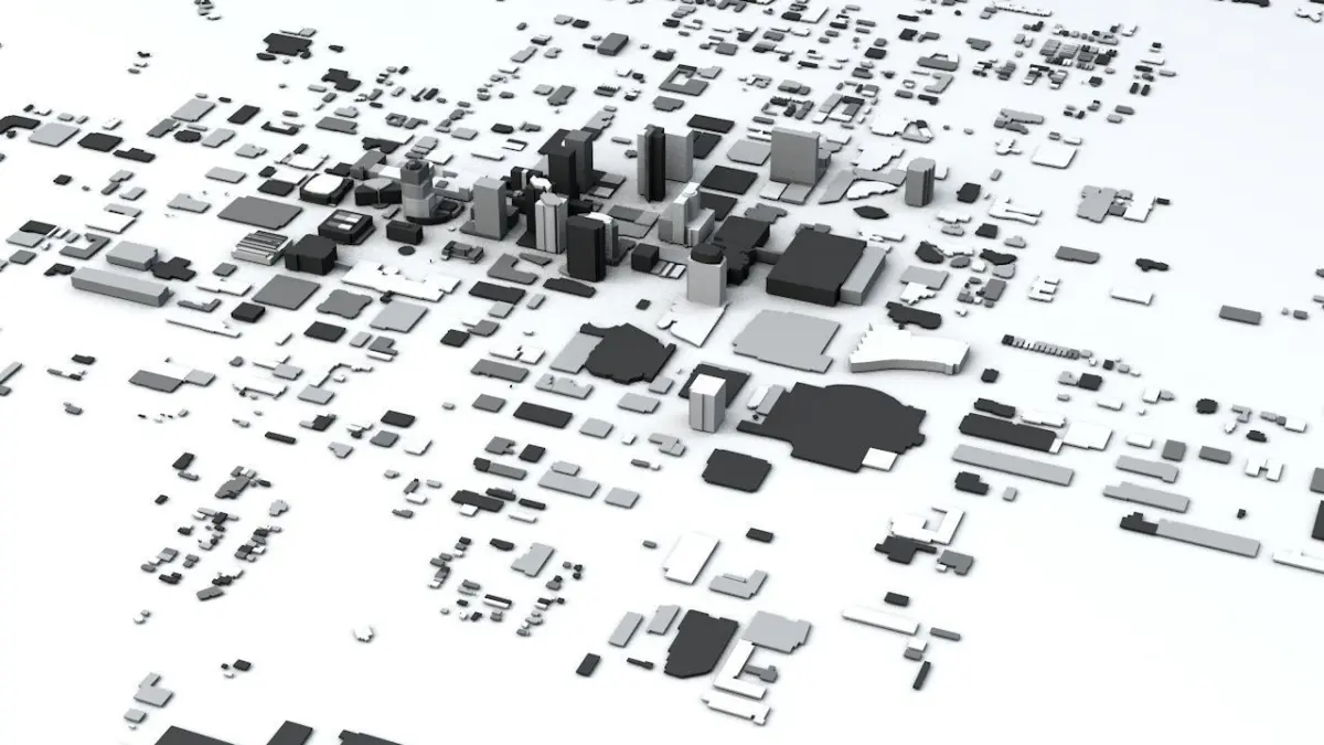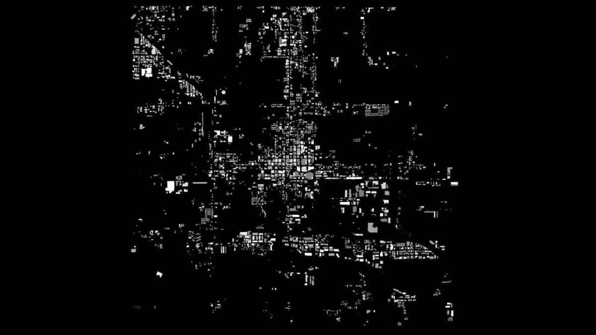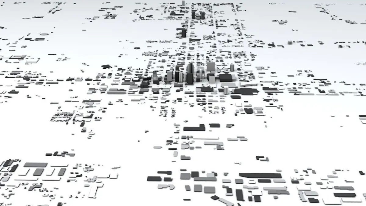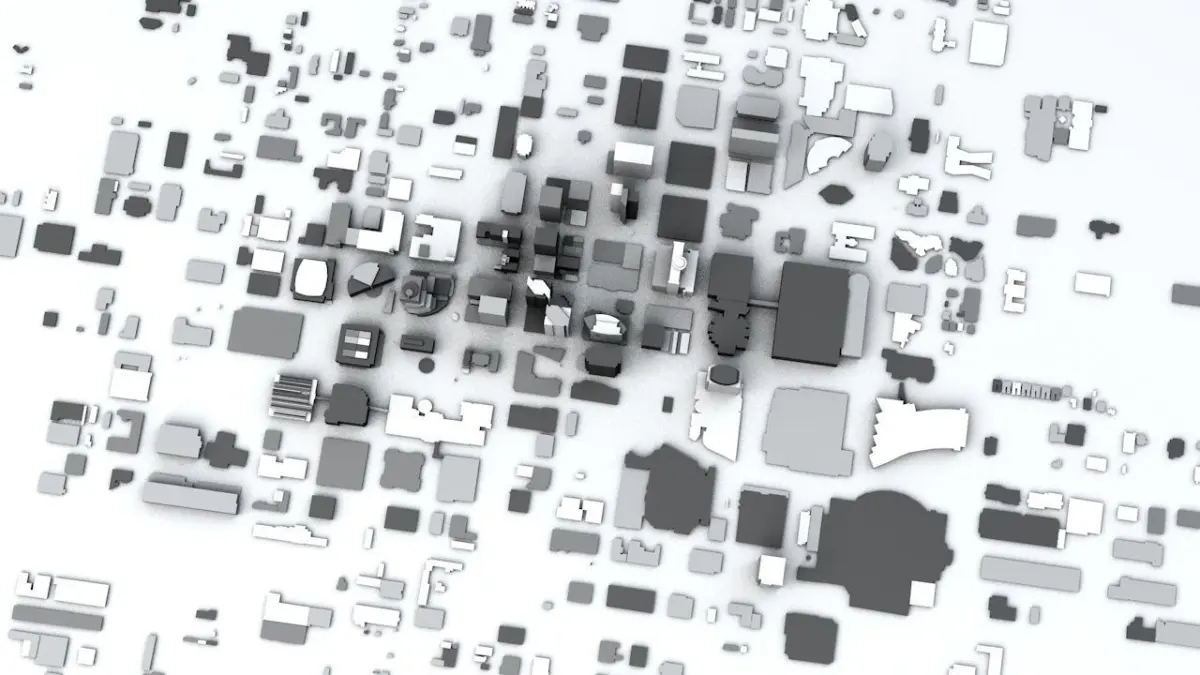 - the model is positioned on a flat surface (all buildings are on the “floor” - no elevation data included)