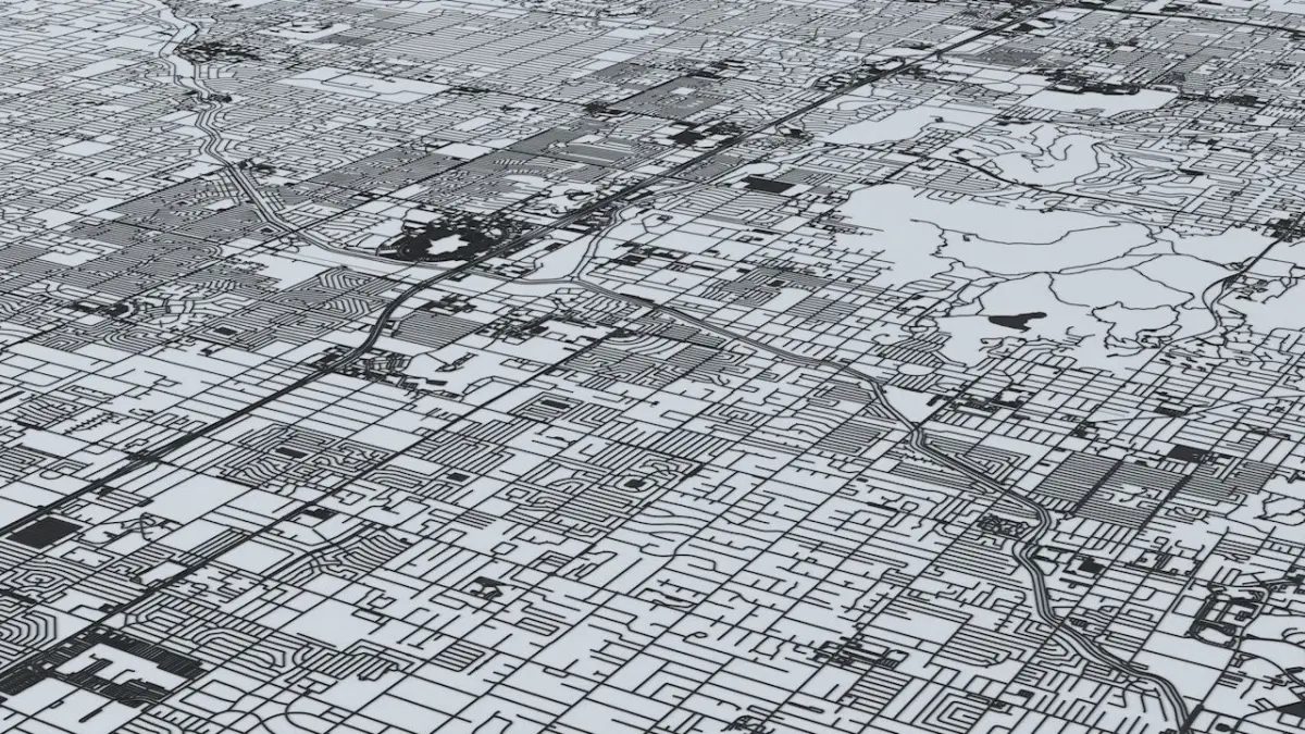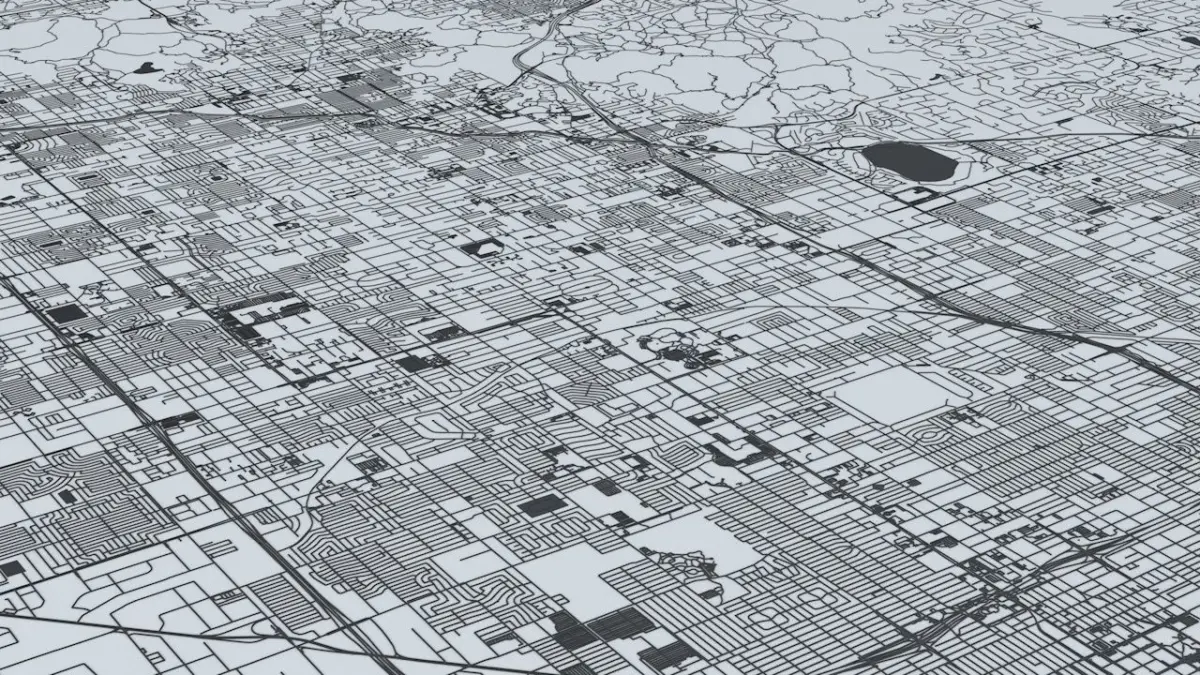 - the model is positioned on a flat surface (road network is on the “floor” - no elevation data included)