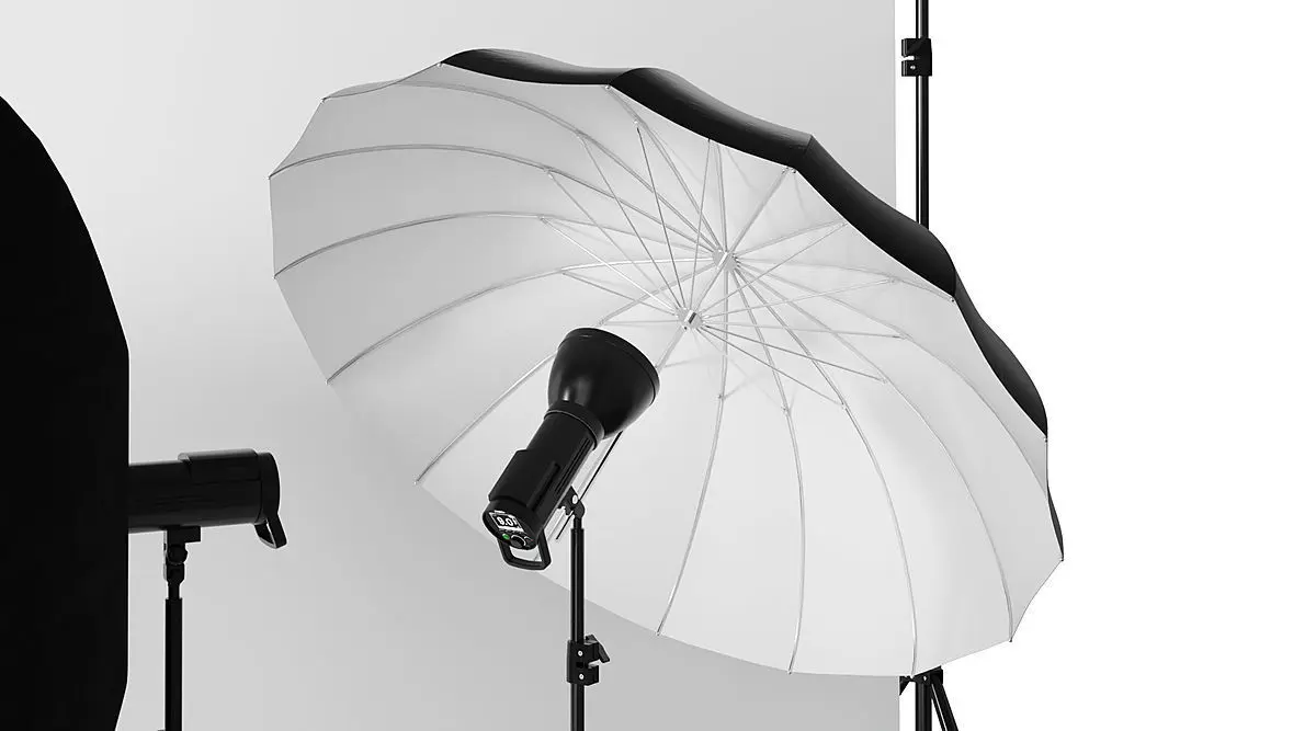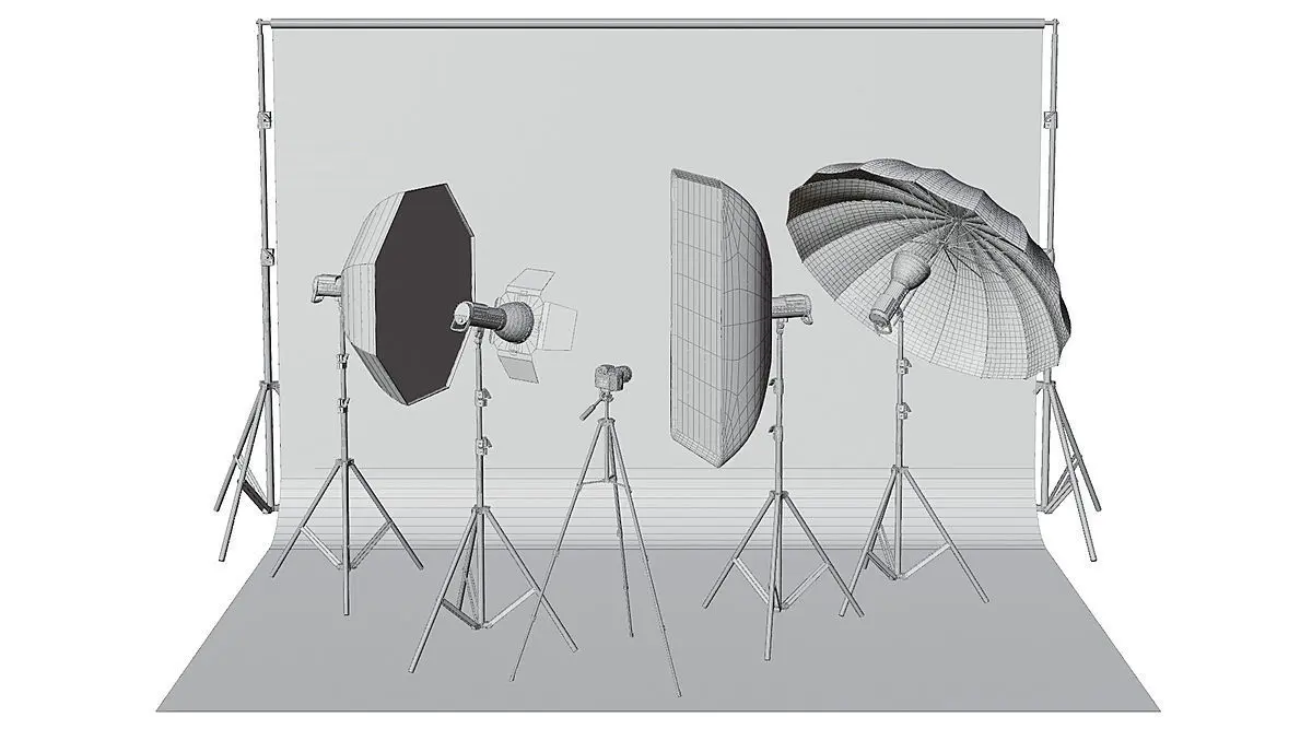 Lighting set with spotlights and softboxes with background and camera for photo studio