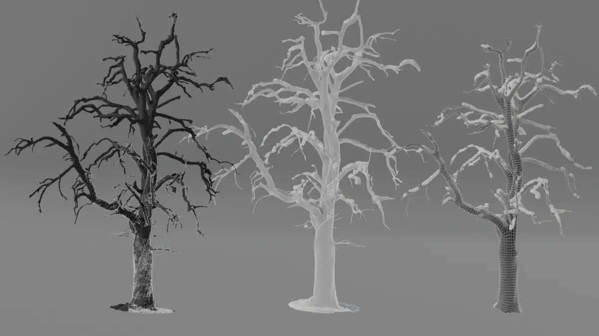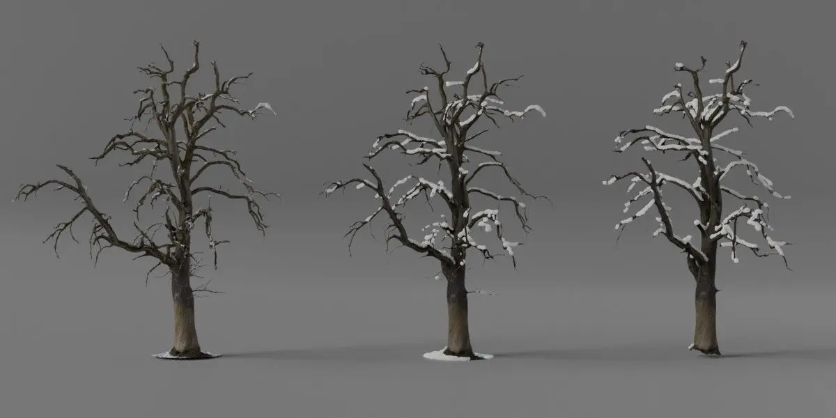 This asset includes photorealistic snow covered apple trees in low poly and mid poly and high poly version for your VFX, Games and 3D environments.The old apple tree is photographed under favourable weather & light conditions, accurate photo scanned with attention for detail. Both types of this pack (lowpoly and midpoly) are retopologized, clean and unwrapped. Ready for use them in a close-up shot or as a particle system.