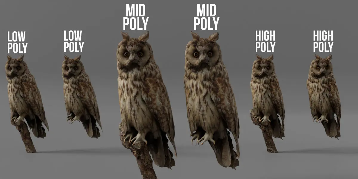 The textures for the midpoly owl model comes in 4k, PNG resolutionThe textures for the lowpoly owl model in 4k, JPEG resolution