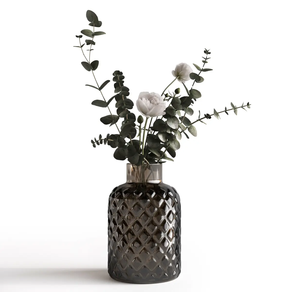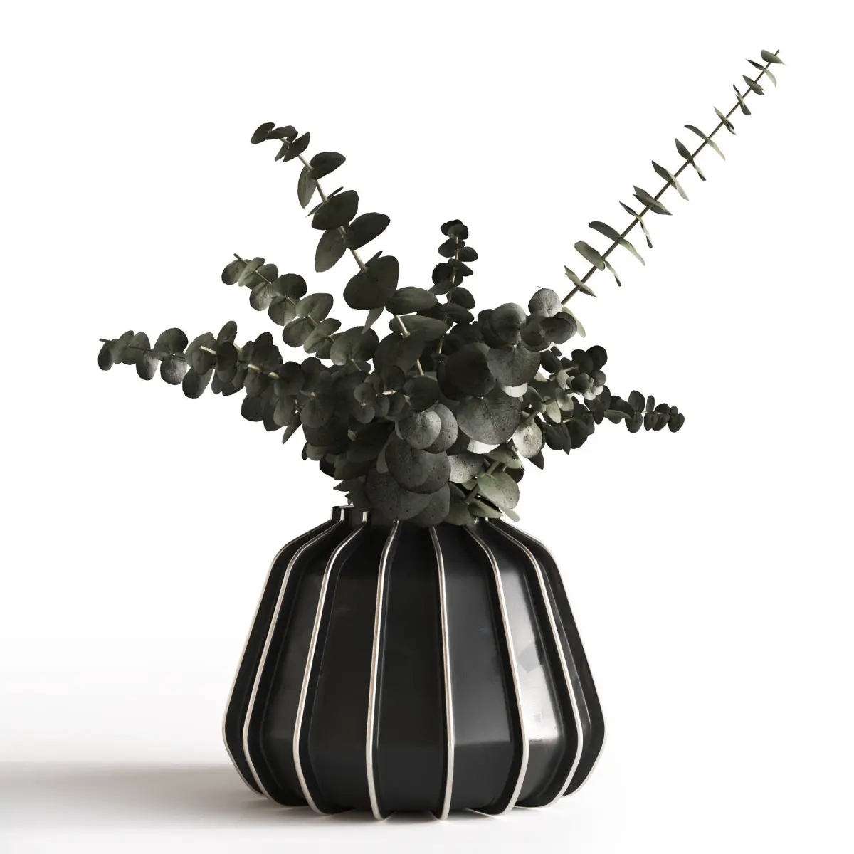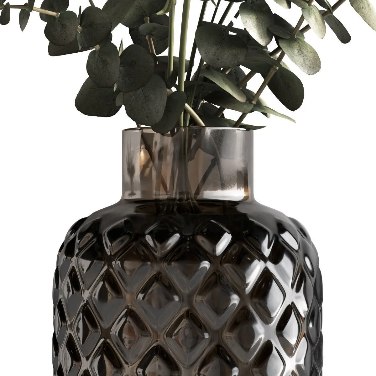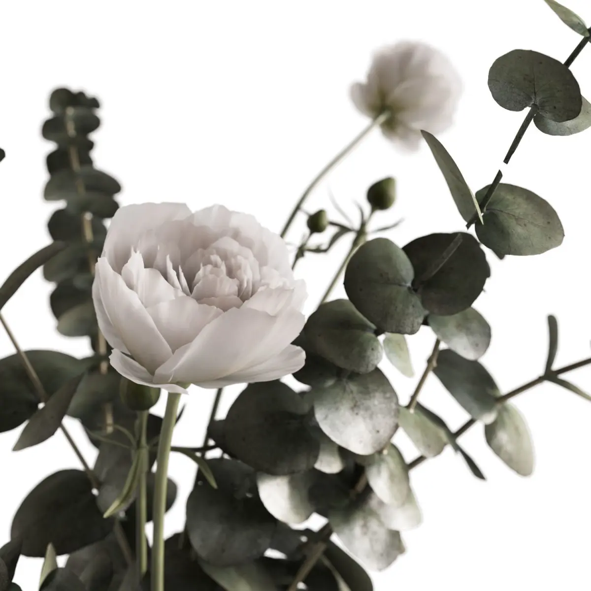 A photorealistic model of two bouquets of eucalypt in a vase. There are two different bouquets
