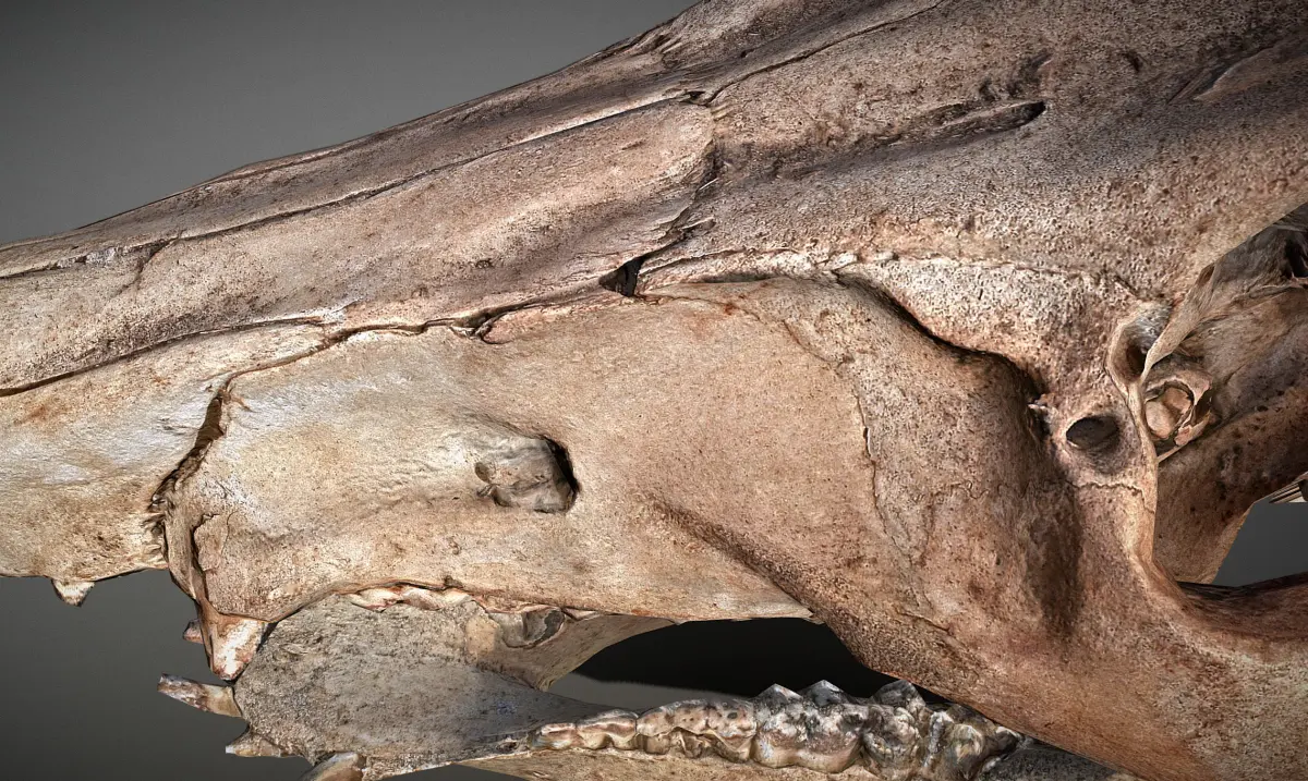 A skull with a lower jaw found in European forest. Approximately 30 cm in length. Most likely a skull of a wild boar. Comes with 4k textures ready to be used for PBR materials. Skull has been retopologized manually retaining high level of detail. Original high poly model obtained using 3d scanning (photogrammetry). Comes in 3 levels of LOD (automatic reduction - not perfect mesh topology). Textures in .jpg and .png has color (diffuse / albedo), height, AO, Normal map, Cavity / bump, metalness and also has uv layout map. Could be used in educational, scientific or learning environment. Suitable for horror films and games.