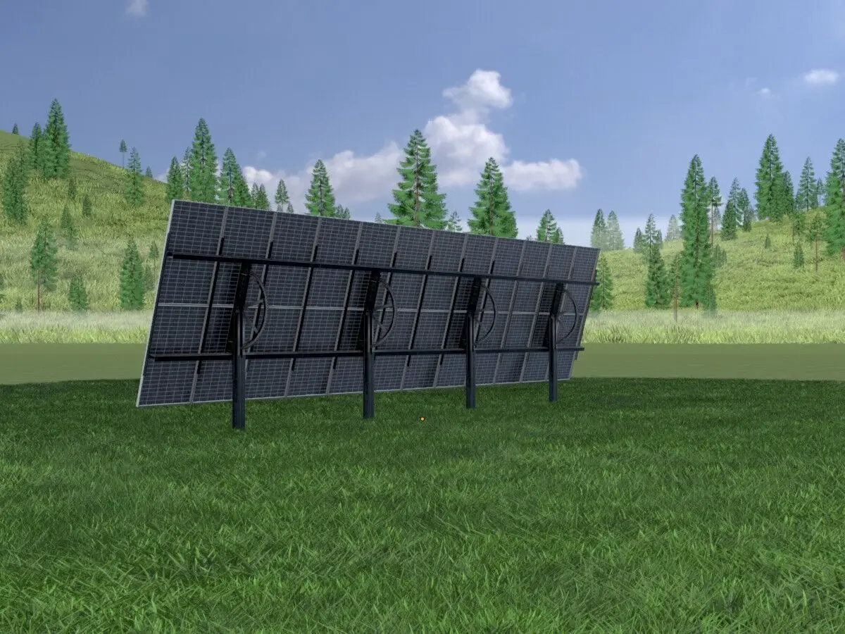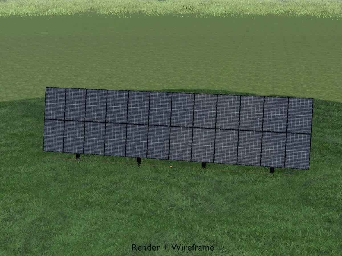 - Hier sehen Sie ein 3D-Modell einer Agri-Photovoltaik-Solaranlage mit einem Neigungswinkel von 165° und einer Breite von 16 Metern.