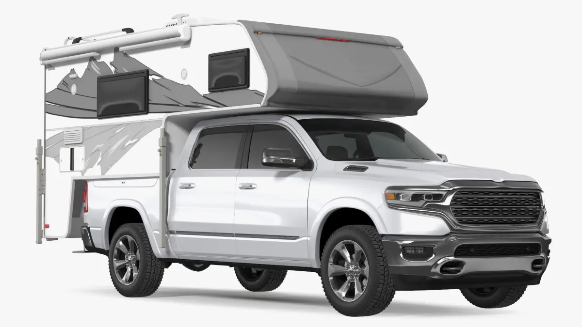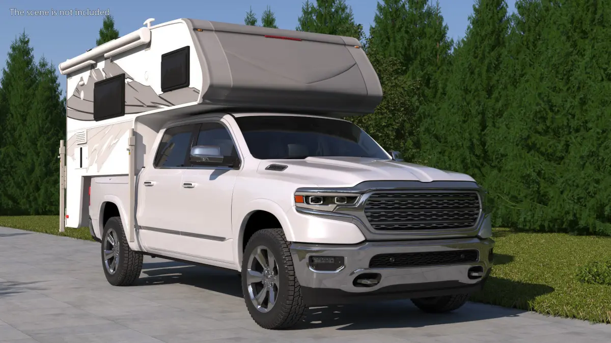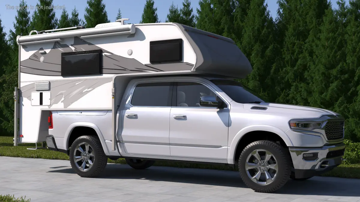 Pickup Truck Camper is a 3D model of pickup type vehicle with specifically designed mobile living unit, which is used to be carried in the bed of a pickup truck. Portable living, pickup truck camper fits onto the bed of a pickup truck. This ingeniously designed unit features a sleeping area, a small kitchen, and a bathroom. Catering to those with a penchant for adventure, it allows for comfortable travel and camping experiences, combining the convenience of a vehicle with the essential amenities of a home, all in one compact package.For trailer automotive machinery, camper road vehicles, popular travel transport, camper vehicles engineering, towed behind vehicles, car accessories, auto service, liveable trailer devices, tourer vehicles, trailer transport vehicles, and camping equipment promotional projects.