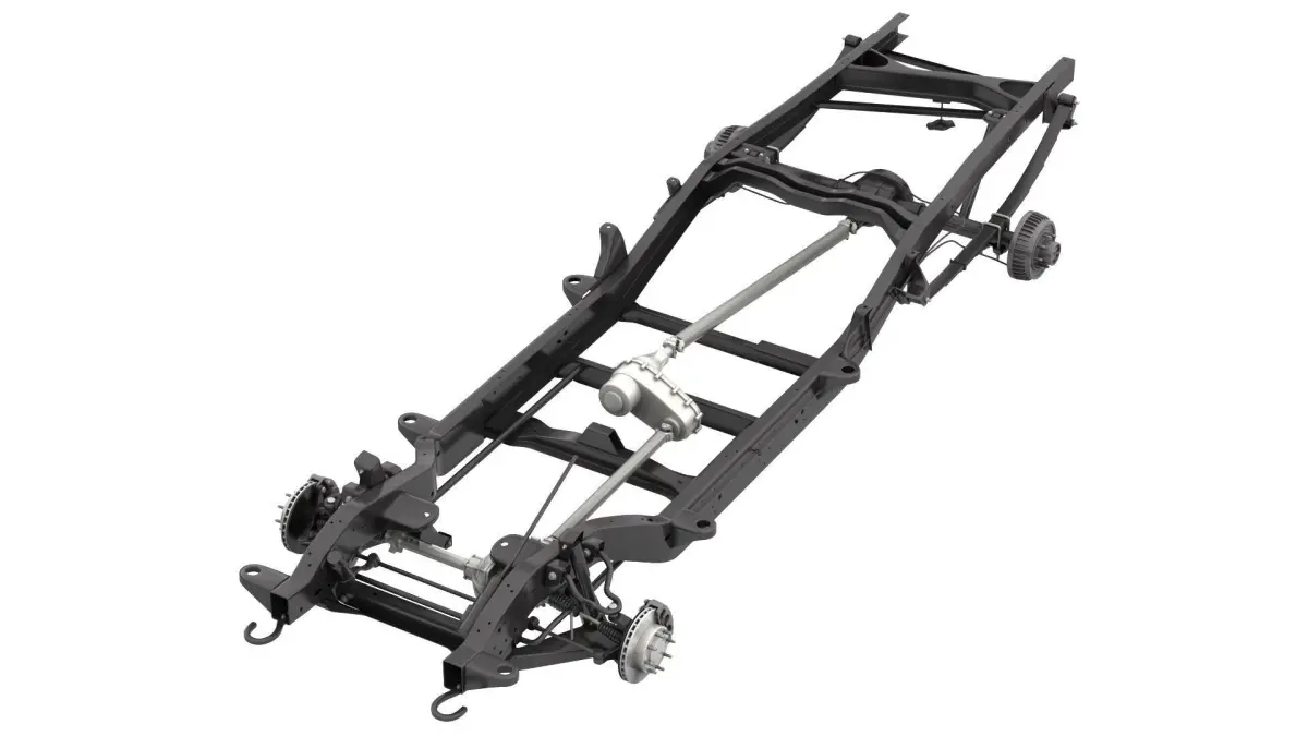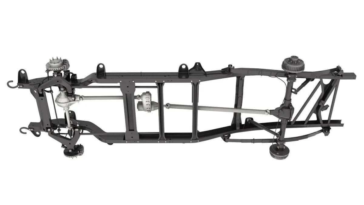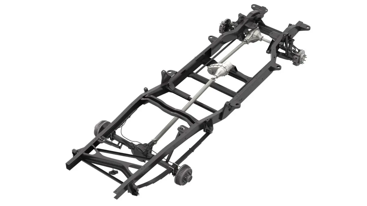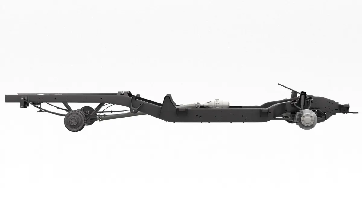 3D model of a modern heavy duty pickup truck chassis for a single cab long bed version with independent front suspension.