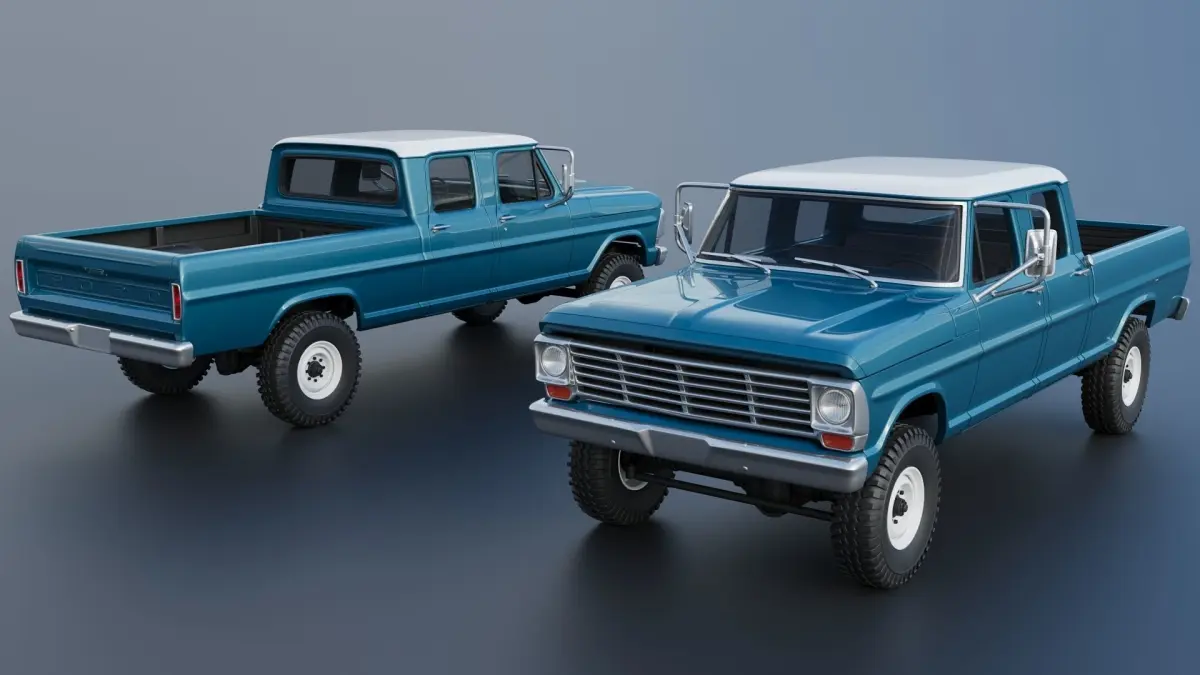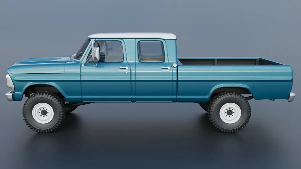 The model includes •Cab •Cab without hood •Hood •Grille •Cab divided into 4 parts •Bed divided into 4 parts •Bumpers •Interior •Chassis •Engine •Wheels •Tires •Windows and glass for headlights and taillights