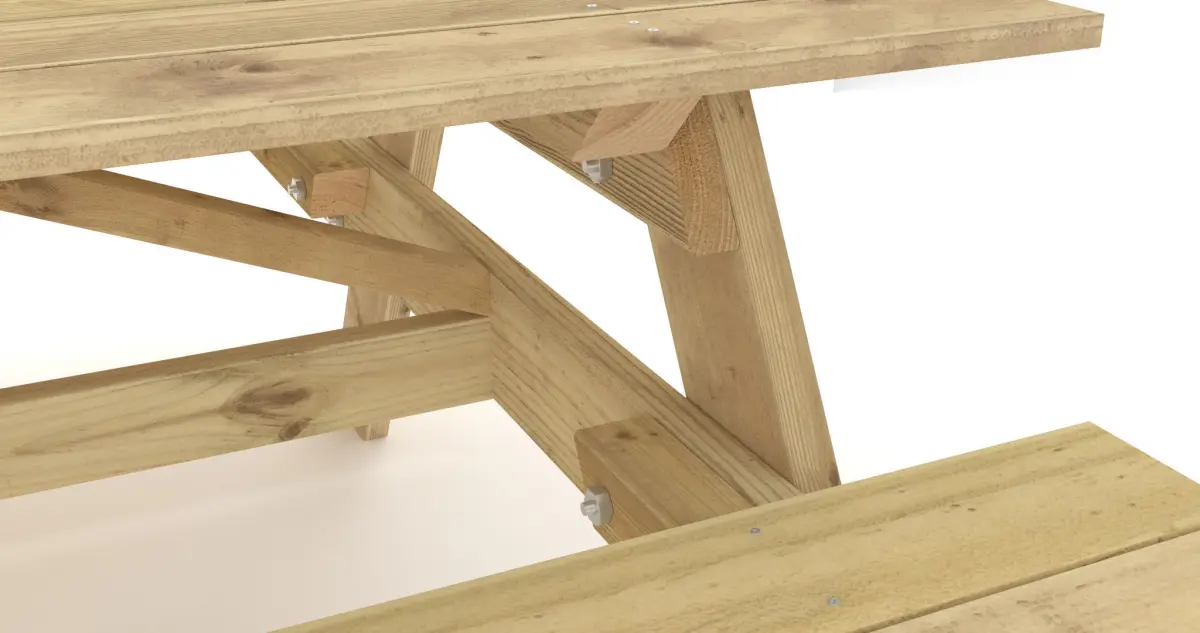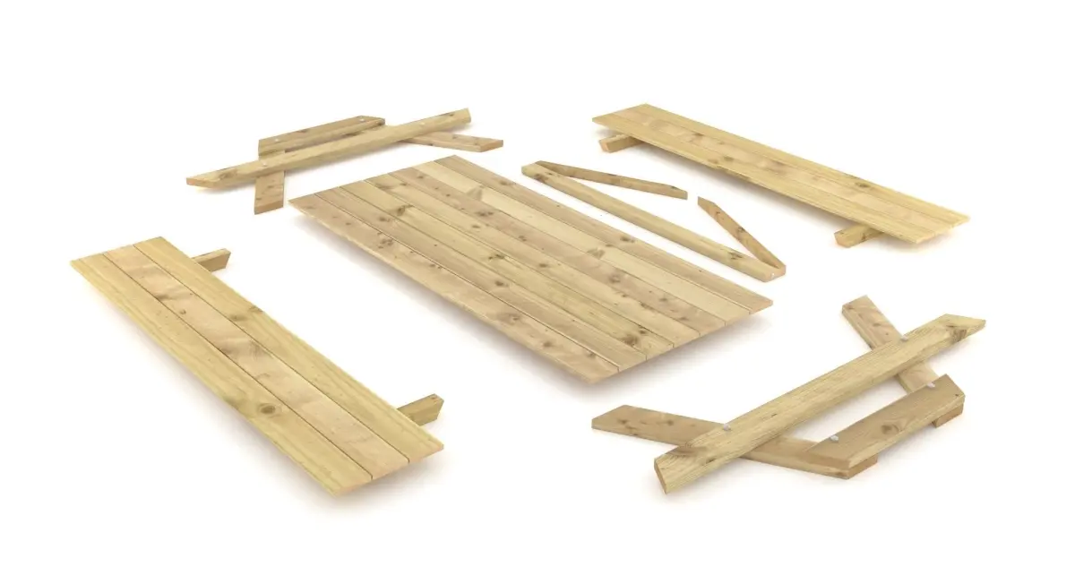 Detailed and realistic model of a wooden picnic table, low polygon, modeled in actual size and measurements (metric centimeters). All parts and materials are properly named, layered and organized.