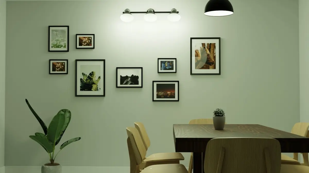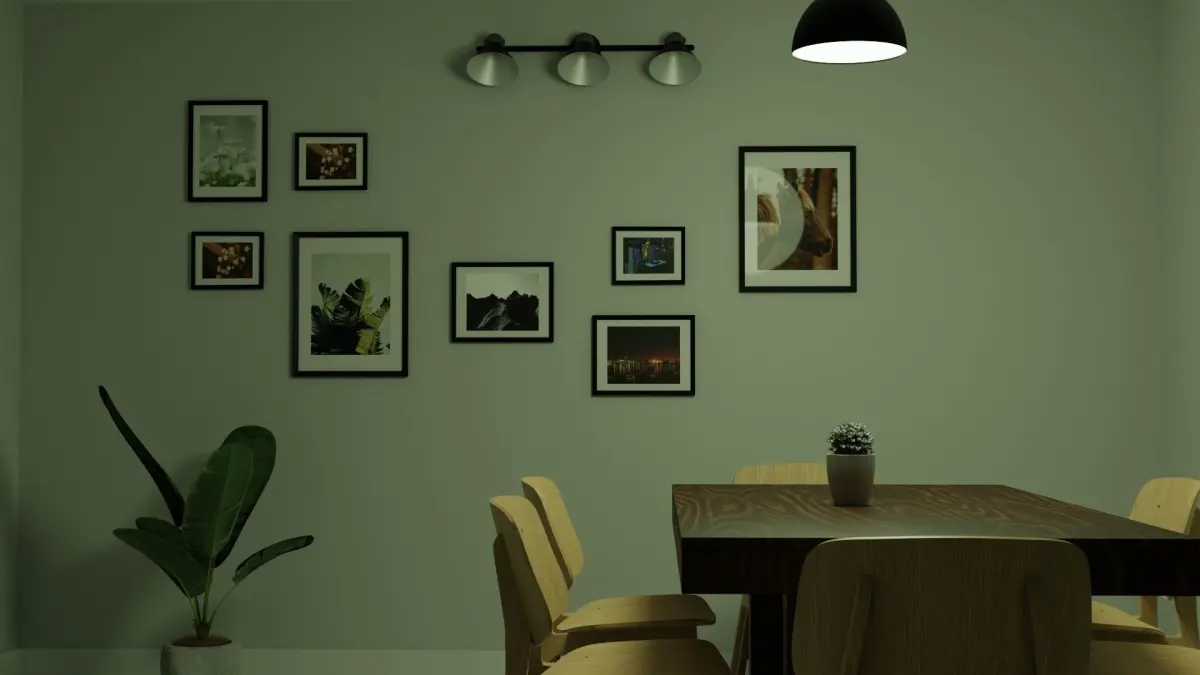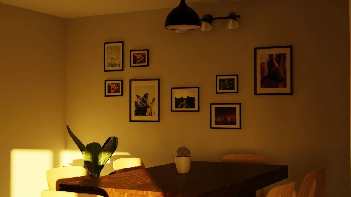 Modelled in Blender.This scene contains a small hall that contains a door and a windows made using Archipack and Archimesh in Blender. The picture frames are also modelled as objects and the face is used as a texture for the image.There is also a dining table with 6 chairs.The sun light is made by using SkyTexture node in Blender