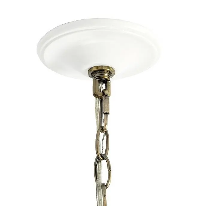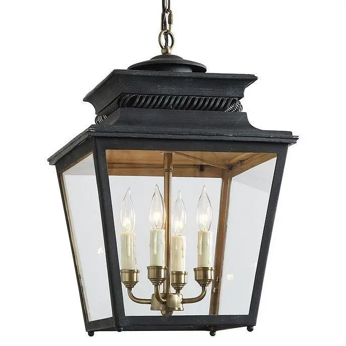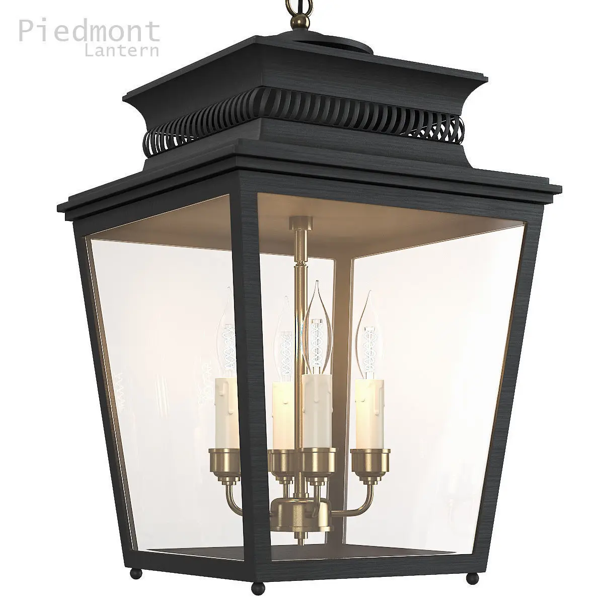 Our Piedmont Lantern has everything we love in a classic lantern shape, from the tiered canopy to the tapered glass panes. Interior is hand painted in a brushed linen color to amplify the light. Four faux drip candle arms and chain are finished in antique brass for dressy contrast