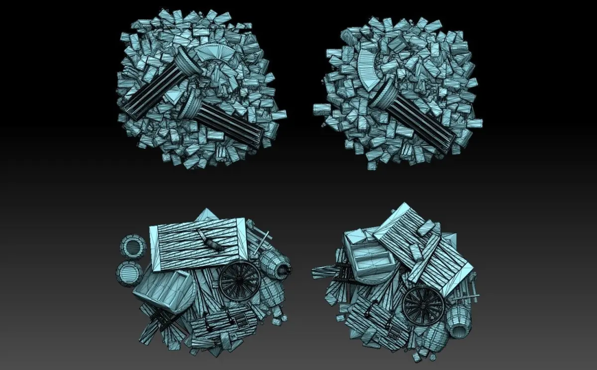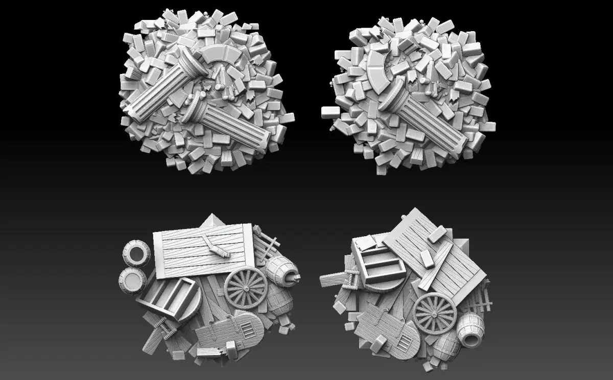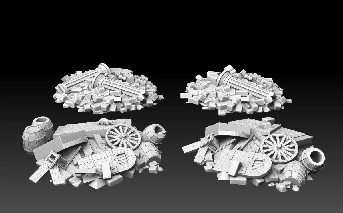 This model pack contains four large heaps of debris (fallen pillars, collapsed arches, mounds of bricks) and refuse (splintered timber, broken wagon wheels, furniture and barrels), some infested with rats.The heaps were originally designed for a dungeon boardgame tileset (still unpublished at the time of writing this). It occured to me that tabletop players might find use for the heaps as standalone models. Suggested use is as rubble blocking city streets, improvised barricades, strongpoints for entrenched infantry, et cetera. The models can be used for any scale between 15mm and 54mm, but are prescaled to 28mm.