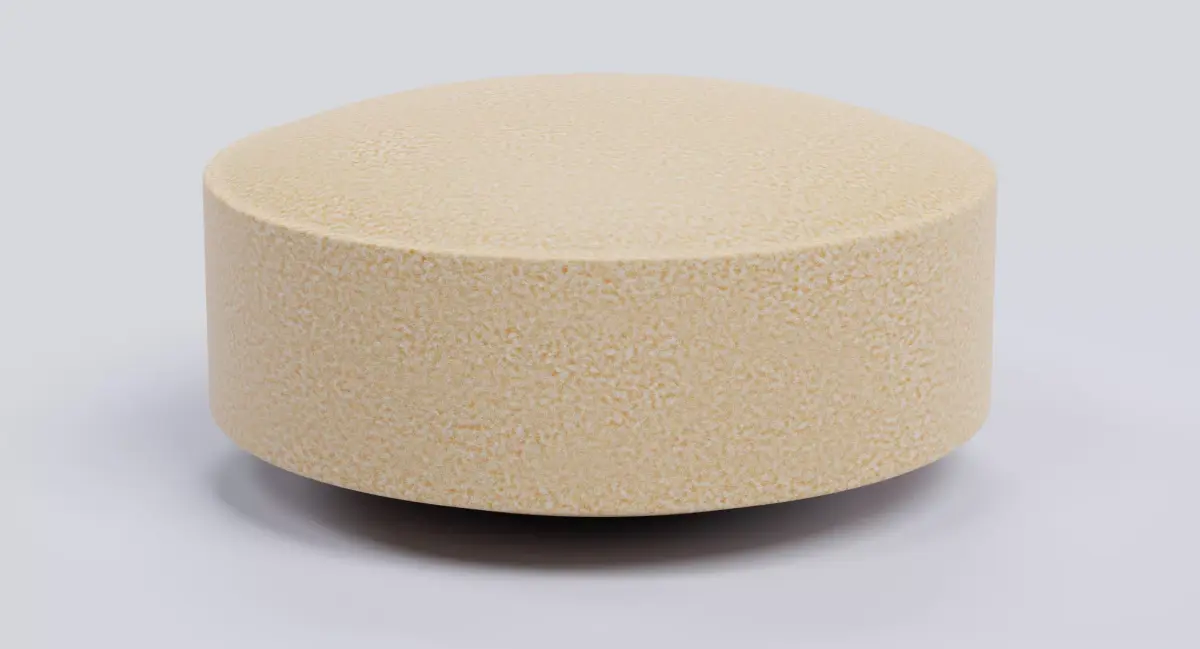 A realistic 3D model of a solid round tablet with a compact, slightly thicker profile, designed to represent a common form of generic medication or dietary supplement. The pill features a soft beige tone with a subtle warm tint and a lightly powdered surface finish, giving it a believable pharmaceutical appearance. Its clean, unmarked design makes it versatile for a wide range of medical, healthcare, and educational visualizations.
