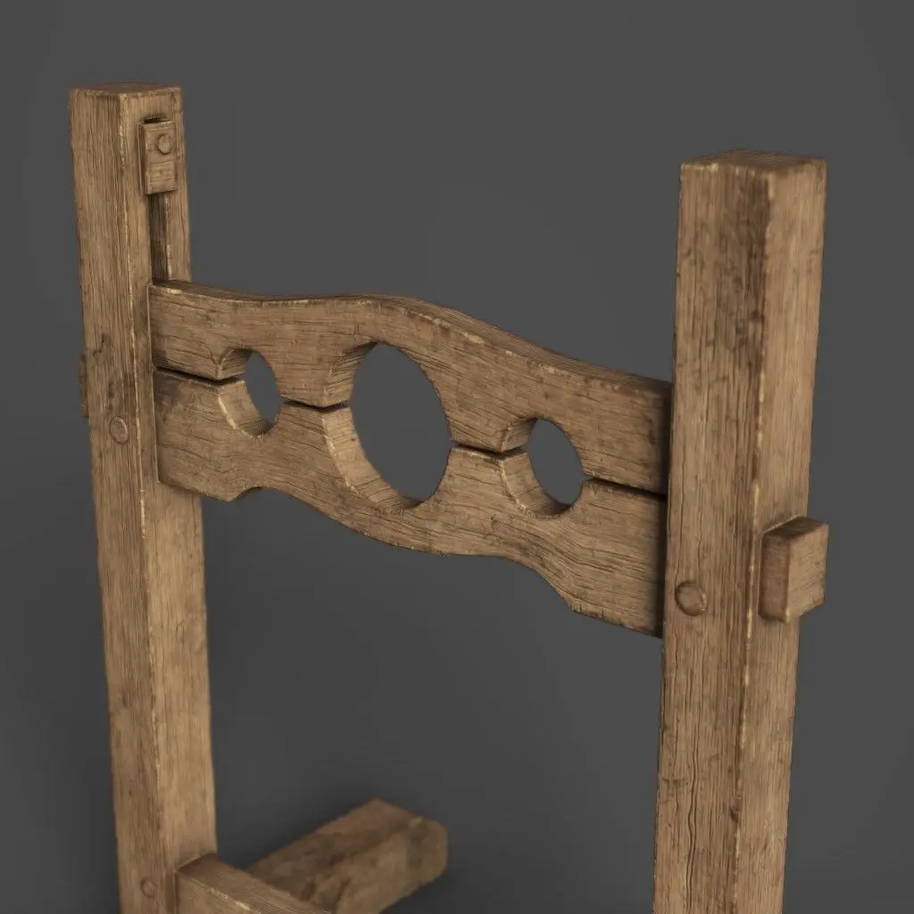 Game ready medieval style pillory. File was created with high to low baking. sliding part of the head restraint has been left separate from the main mesh to allow it to be opened and closed.