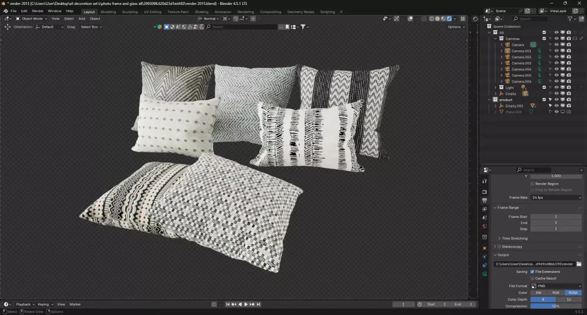 High-quality 3D model of Pillow set featuring furniture item called Pillow set for intorior or extorior decoration. The download includes the native Blender file with full material and lighting setup, as well as OBJ and FBX exports for compatibility with other software. Both high-poly and optimized low-poly meshes are provided, along with pbr textures (Color, Normal, Roughness, Displacement, and Subsurface Scattering). All assets are UV-mapped and ready for use in rendering, animation, or real-time projects.