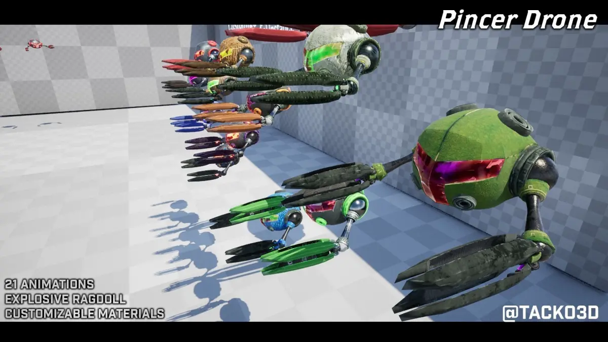 One of the most reliable attack drones on this side of the galaxy.Customize your own Attack Drone with the Ultimate Customizable Material InstanceThis new asset is a remake of one my first asset packs. Revamped design, New Animations, Better Textures and Update material SystemWith 21 animations and an Explosive Physics Asset that serves as the perfect death state3 material Slots - Body Material (Pick 3 colors and modify textures with tiling textures), Glass Material for the Visor and Lights material for the lights(DOES NOT INCLUDE YAKOHAMA ENVIRONMENT FROM GALLERY IMAGES)Rigged: (Yes)Rigged to Epic skeleton: (No)If rigged to the Epic skeleton, IK bones are included: (No)Animated: (Yes)Number of Animations: 21Animation types (In-place): 4 Hit React Animations, 9 Attack Animations, 6 Directional Movement Animations (Up, Down, Left, Right, Forward, Backwards), Idle and Idle Breaker animationsNumber of characters: 1 CharacterVertex counts of characters: SKM_PincerDrone - 18,579Number of Materials and Material Instances: 24 Materials - (3 Materials 21 Material Instances)Number of Textures: 39 TexturesTexture Resolutions: (512, 2048, 4096)