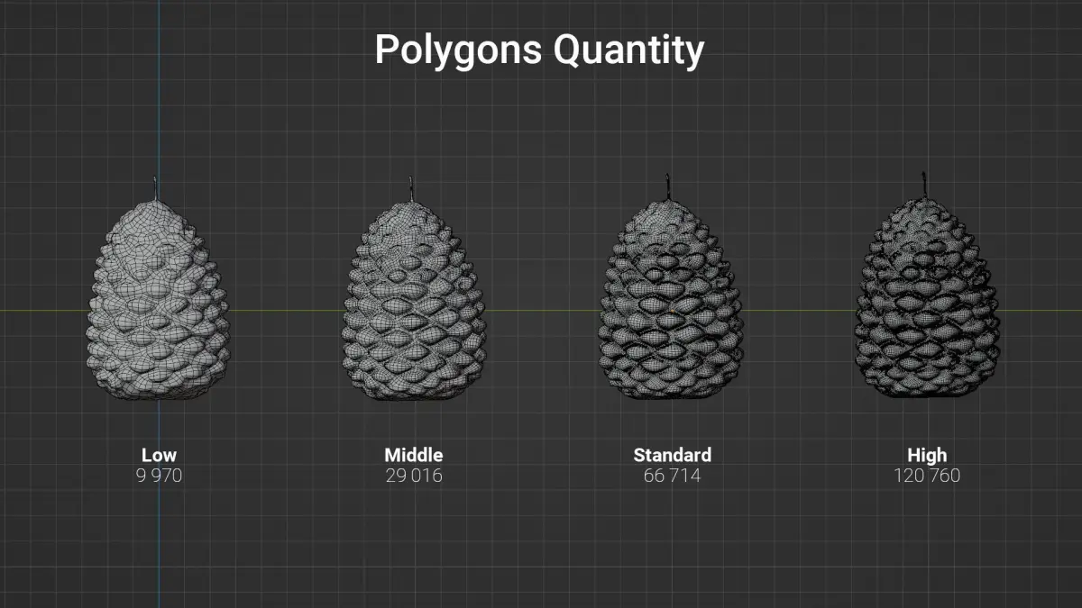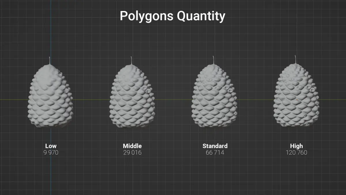 This model is based on a real Pine Cone Candle. To facilitate widespread use, the model and textures are available in multiple resolutions.