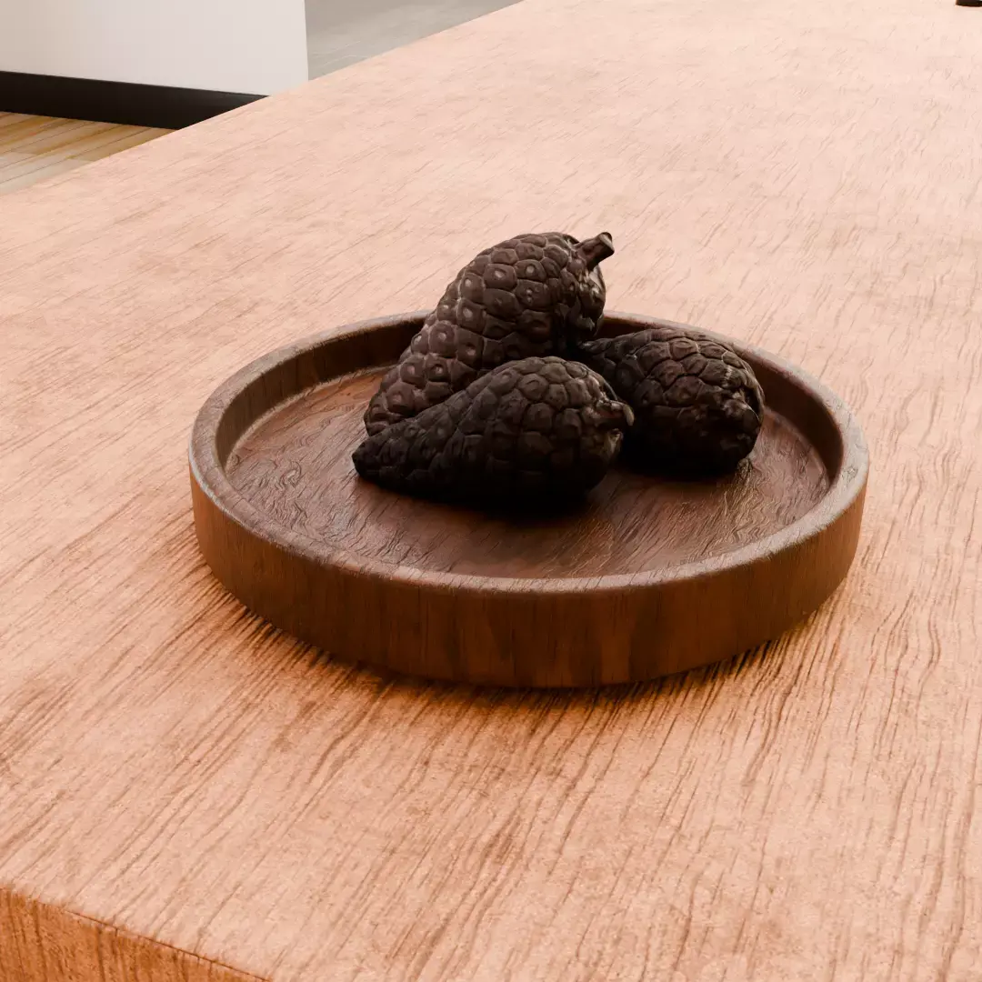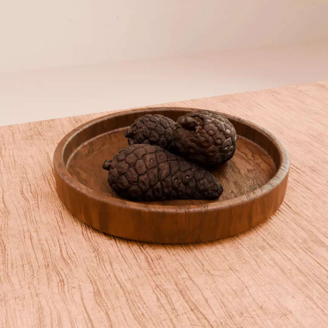 This 3D model features a small decorative arrangement consisting of two pine cone–like natural elements placed on a shallow wooden tray. Designed as a versatile prop asset, it is ideal for enriching interior scenes with subtle, organic detail.